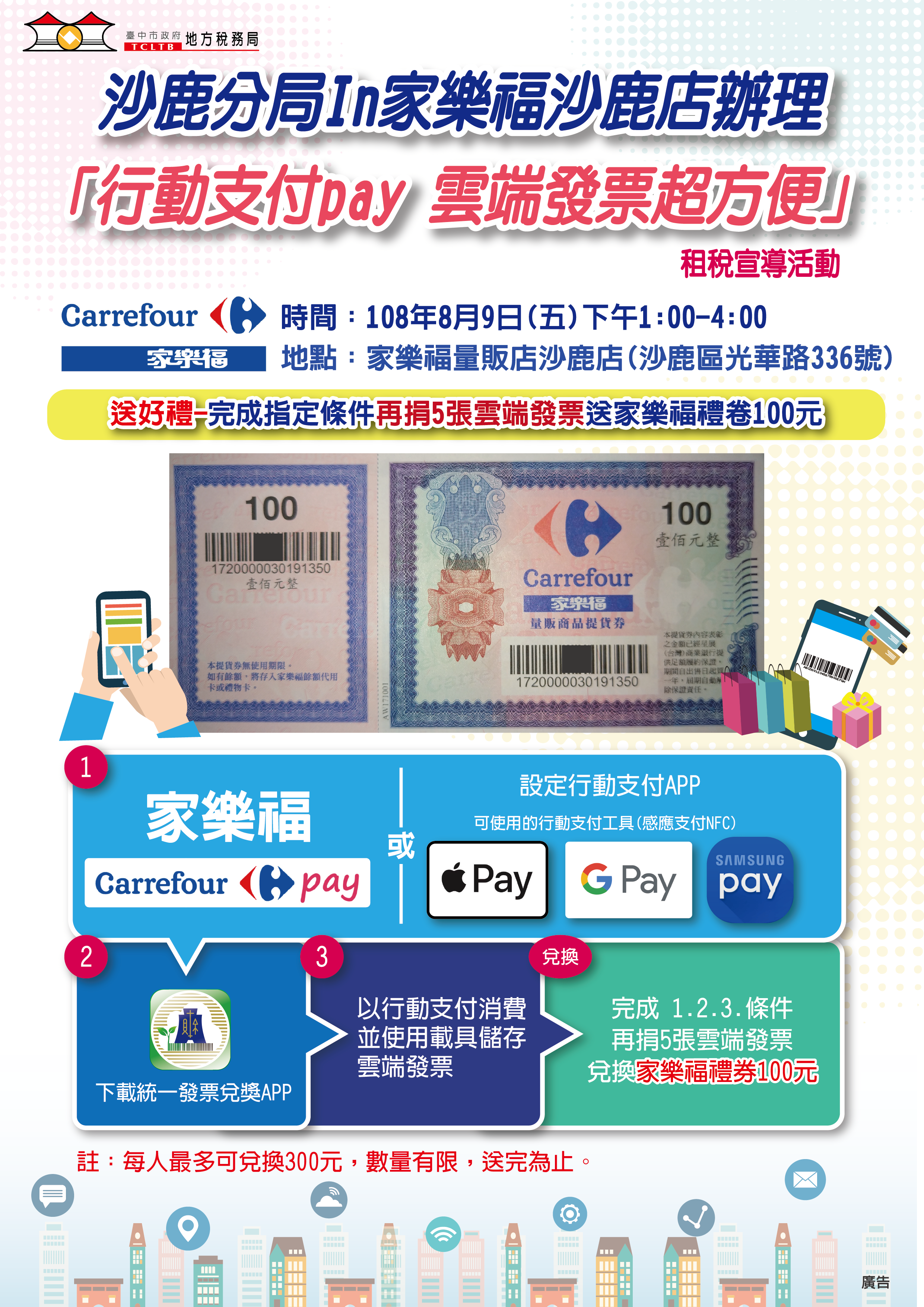 台中市政府地方稅務局沙鹿分局將於8月9日下午1時至4時在家樂福沙鹿店辦理「行動支付pay 雲端發票超方便」租稅宣導活動,現場使用行動支付消費並將發票存雲端,出示財政部「統一發票兌獎」App並捐贈今年7-8月份實際付款金額5元以上雲端發票5張,即可獲得家樂福100元禮券1張,每組手機條碼限換3張,兌完為止,歡迎共襄盛舉。