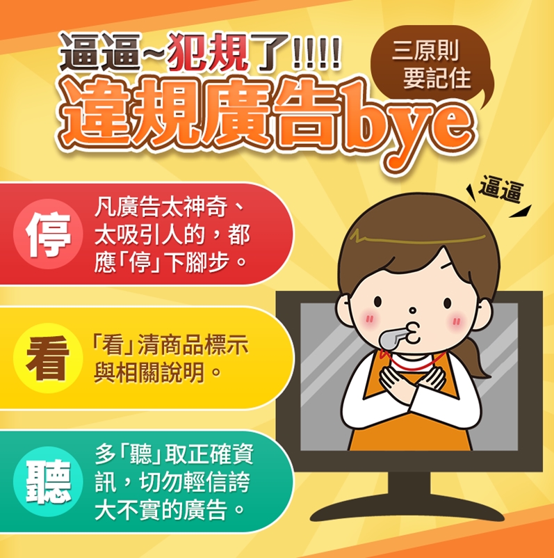 食安處呼籲,在網路等通路刊登販售產品時,要特別注意產品屬性,一般商品不得以誇大、宣稱療效等不實資訊,增加產品的銷售量,以免違法遭罰。買家在購買商品時,謹記三原則「停、看、聽」,凡是廣告太神奇、太吸引人,請「停」下腳步;「看」清商品標示與相關說明;多「聽」取正確資訊,切勿聽信誇大不實廣告。(8/8*18)*衛生局