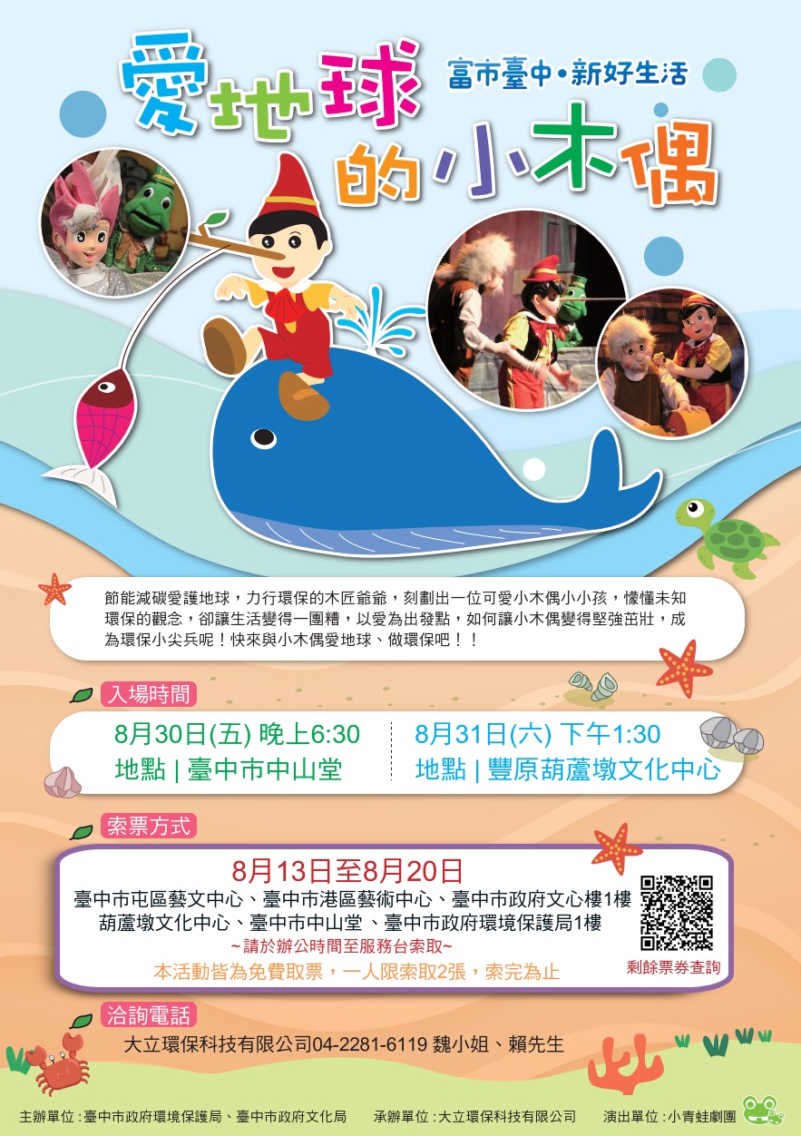 環境教育向下扎根!台中市政府環保局邀請小青蛙劇團演出「愛地球的小木偶」兒童劇場,分別於8月30、31日在台中市中山堂、葫蘆墩文化中心演奏廳登場, 8月13日起免費索票。環保局表示,「愛地球的小木偶」改編童話故事「木偶奇遇記」,透過活潑生動的音樂、舞蹈及戲劇,傳遞孩童環保理念,歡迎進場欣賞。