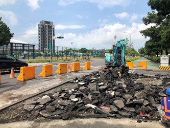 其中,潭子區四尺八分線灌溉溝當天立即堆置沙包應急處理,今日進場打除溝中溝,再擴大通洪斷面;針對南屯區向心南路與文心南七路口汙水孔溢水損壞路面,考量行車安全,當日已先行擺設交通錐及紐澤西護欄緊急封閉道路,今早即調運機具進場搶修,預計傍晚恢復部份車道通行。