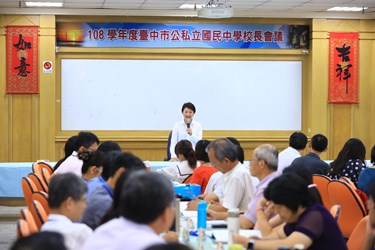 台中市政府教育局今(16)日召開108學年度台中市公私立國中校長會議,96位校長及代表出席,市長盧秀燕到場頒發國中組教學卓越獎初選獎座,她強調,市府將積極更新及補強老舊校舍,改善校園安全防護設施、設備,強化校園安全,建立完善校園危機處理機制,營造讓孩子們安心的學習環境。