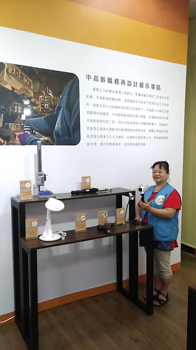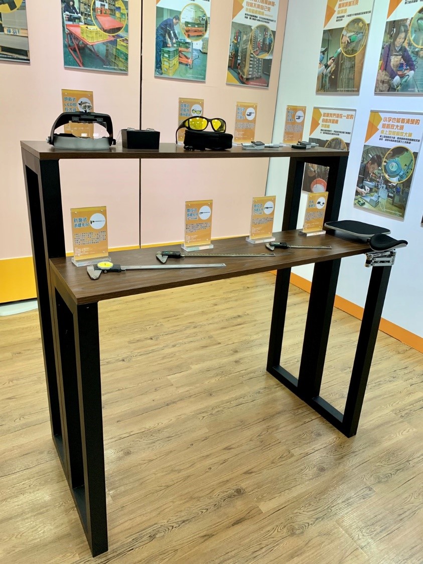 吳局長指出,「中高齡職務再設計實體展示專區」輔具包括測量類(如電子式游標卡尺、液晶內徑分厘卡等)、視力輔具(如實務攝影機、放大鏡燈及攜帶式LED工作燈等)、推車類(如油壓升降台車等)及其他省力工具,除了讓事業單位實際體驗,另有輸出大型工作設備圖片及職務再設計相關介紹資訊可提供企業參考。