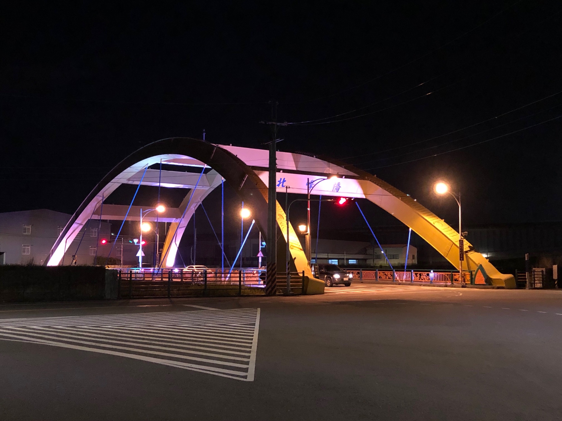 台中霧峰區北峰橋橋身採黃色鋼拱圓弧造型,融入乾溪及草湖溪景觀,民眾沿著鄰近的乾溪自行車道,通行橋上時可一覽河岸風光。為讓暢遊乾溪自行車道的民眾擁有夜間駐足休憩的景點,並使北峰橋成為當地具觀賞特色的重要橋梁,台中市政府建設局於北峰橋裝設6盞投射燈,整座橋身呈現紅、藍、黃三種繽紛色調,營造橋梁日夜不同風貌,也兼顧夜間通行者安全。
