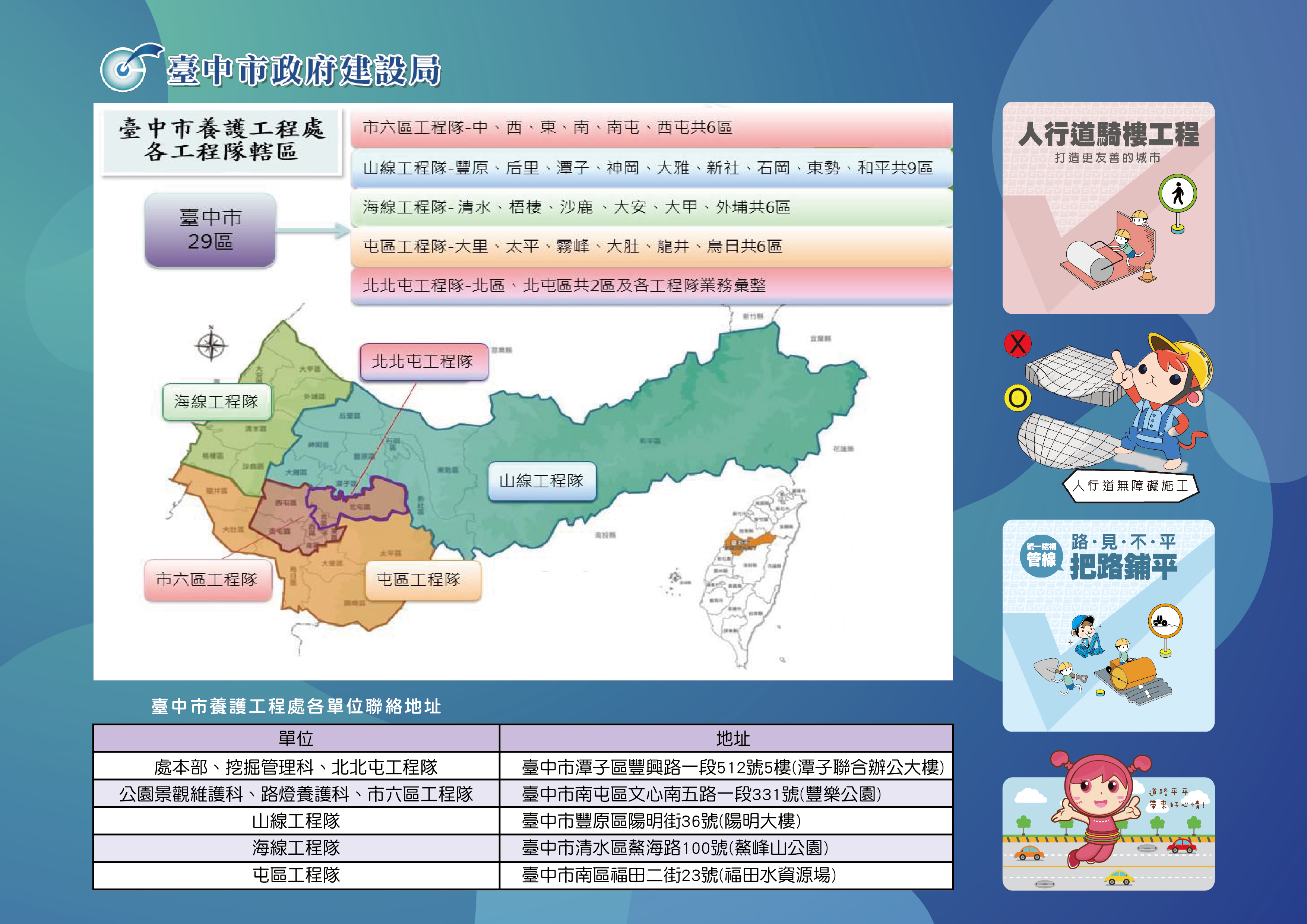 一、市六區工程隊:負責中區、西區、東區、南區、南屯區、西屯區。