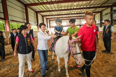 台中市長盧秀燕關心在地產業,今(20)日於神岡區召開行動市政會議後,特別前往當地神馬郡休閒農場,了解馬場運作情形,關懷正在進行馬術適應性運動的身障孩童。盧市長感謝農場發揮愛心,安排專業人員及活動,幫助身障者透過與馬兒間的情緒感應及刺激,提升其感覺統合能力,貢獻社會值得肯定,令人動容。