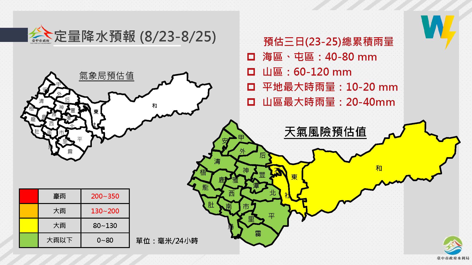 此外,市府提醒民眾於颱風期間,應保持危機意識,並可利用手機及平板電腦下載「臺中水情APP」,查詢全市淹水、土石流、避難場所等水情資訊,隨時掌握本市最新水情,並加入路況及空氣品質等生活訊息,民眾只要在App Store或Google Play搜尋「臺中水情」即可免費下載安裝,如遇淹水或水利設施災情,也可透過台中市民一碼通「1999專線」進行通報,以利市府快速搶修。(8/22*22)*新聞局