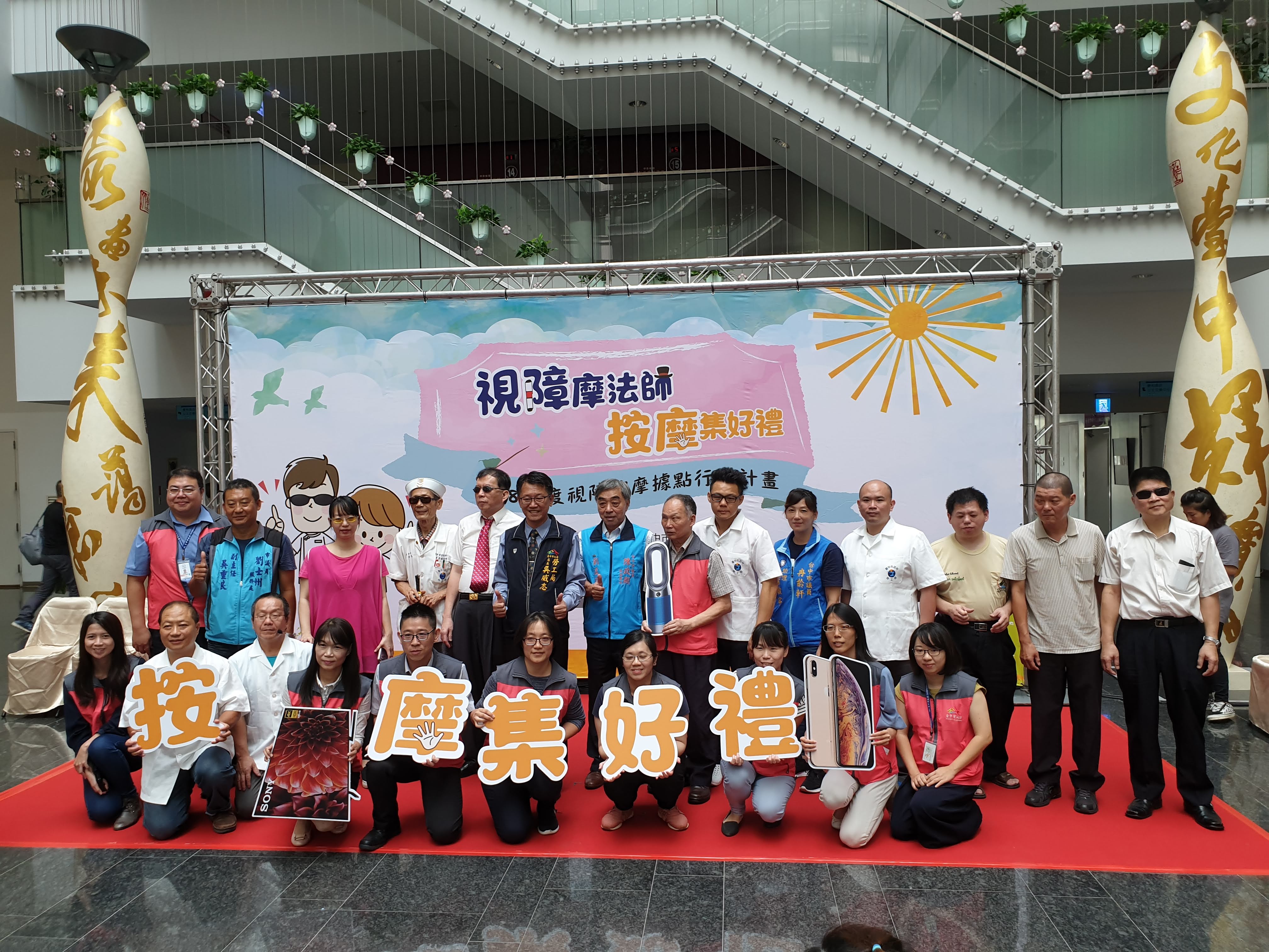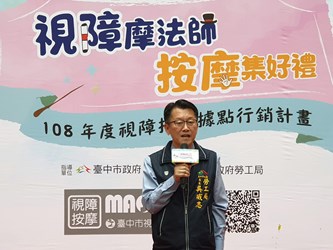 為提升視障按摩經營競爭力,台中市政府勞工局首創「視障按摩據點評鑑機制」,將評鑑優良視障按摩據點公佈台中市視障按摩服務網方便民眾搜尋,今(23)日至10月31日特別辦理「視障摩法師按摩集好禮」視障按摩行銷活動,單次消費滿200元(含)以上得1點,集滿10點可抽3C、家電等好禮,歡迎民眾支持優良視障按摩據點。
