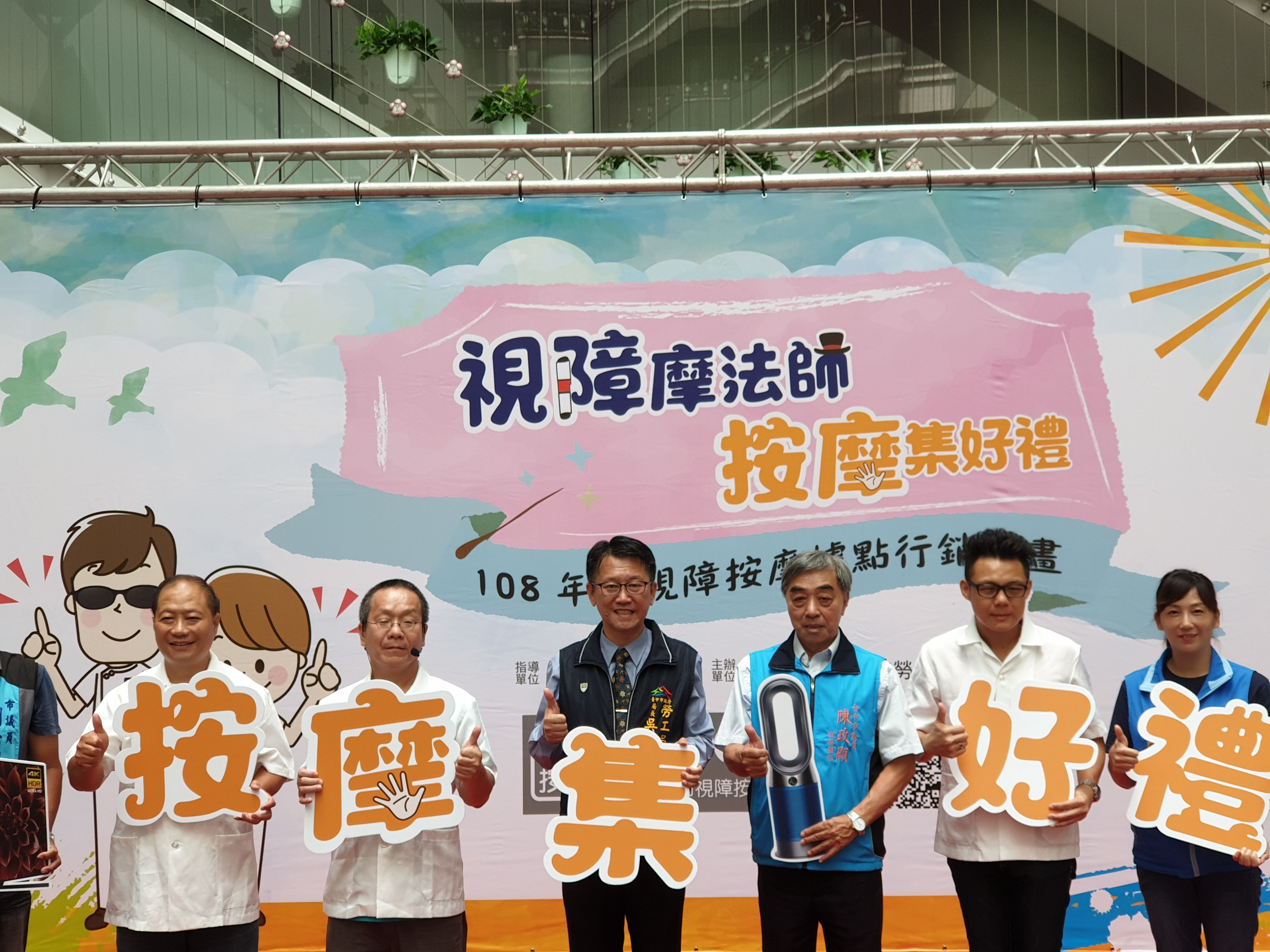 勞工局指出,勞工局領先全國首創「視障按摩據點評鑑機制」,依照視障按摩據點的環境、設備、清潔和服務創新等10大面向進行評分,讓視障按摩業者自我檢視,改善經營模式並提升競爭力。民眾可透過台中市視障按摩服務網(http://msg.taichung.gov.tw/)搜尋鄰近的優良視障按摩據點。活動詳情請上「視障摩法師 按摩集好禮」活動粉絲頁(https://bit.ly/2Zd4ivt)查詢。(8/23*14)*勞工局