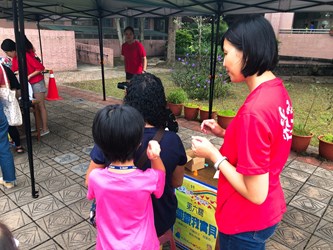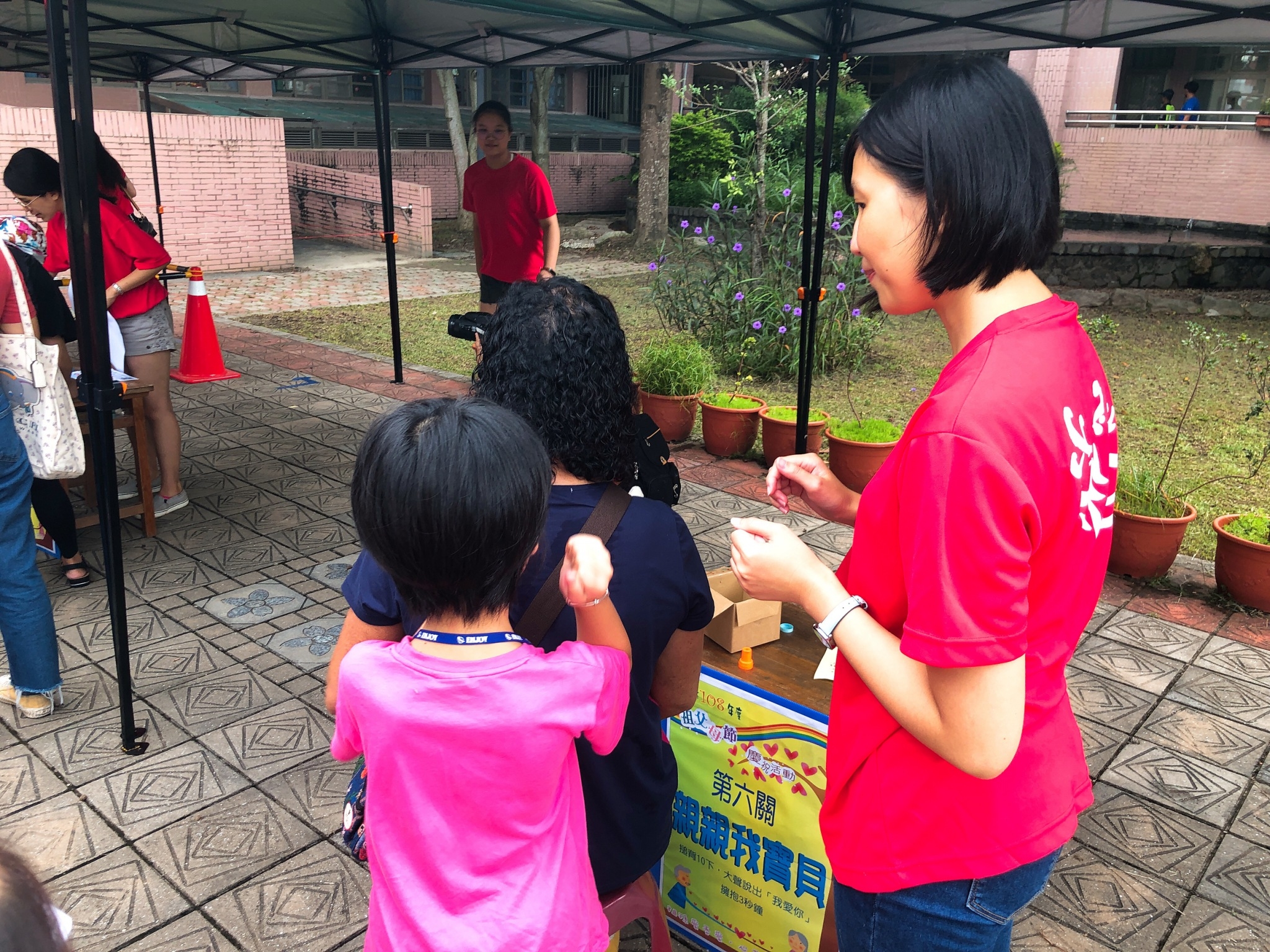 今日活動在東勢區新盛國小舉行,推出有趣的祖孫互動活動,包含幫爺爺奶奶搥背5下、大聲說出「我愛你」、熱情擁抱5秒鐘、合作挑戰保齡球等;另外還有「樂齡健康巡迴車」可以唱卡啦OK增添長者樂趣,現場也有客家美食品嚐、家庭教育宣導講座、植物組盆DIY等活動,讓來參與的祖孫共享天倫樂,教育局專門委員賴緣如也到場同樂。