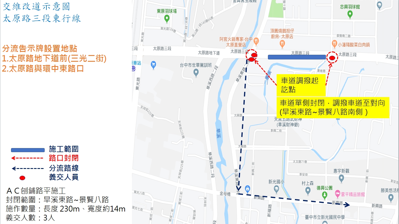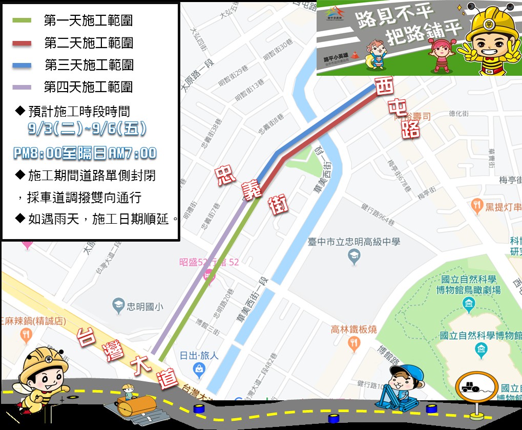 陳局長指出,原訂於8月22日啟動的太原路及忠明路燙平作業,因白鹿颱風襲台,考量工程品質及施工人員安全而暫緩施工。目前颱風已遠離,且未帶來西南氣流雨勢,市府已於昨日重新施作太原路燙平作業,忠明路則將於8月30日起重新施工,2路段均採單向道路封閉、對向道路採調撥車道方式進行,以降低施工造成的交通衝擊。若氣候條件允許,可望於9月中旬完工。