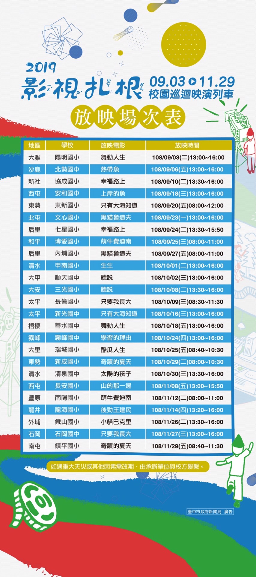 台中市政府新聞局所舉辦的「2019影視扎根-校園巡迴映演列車」,將於9月3日至11月29日前進台中市25所國中小學校巡迴放映,今年以「青春、人生、冒險」為主題,精心挑選17部國內外劇情片、紀錄片及動畫影片,並邀請7位電影工作者、影評人和專業講師組成講師團,期盼透過映前、映後座談,帶領學生認識影視產業,深耕影視教育。