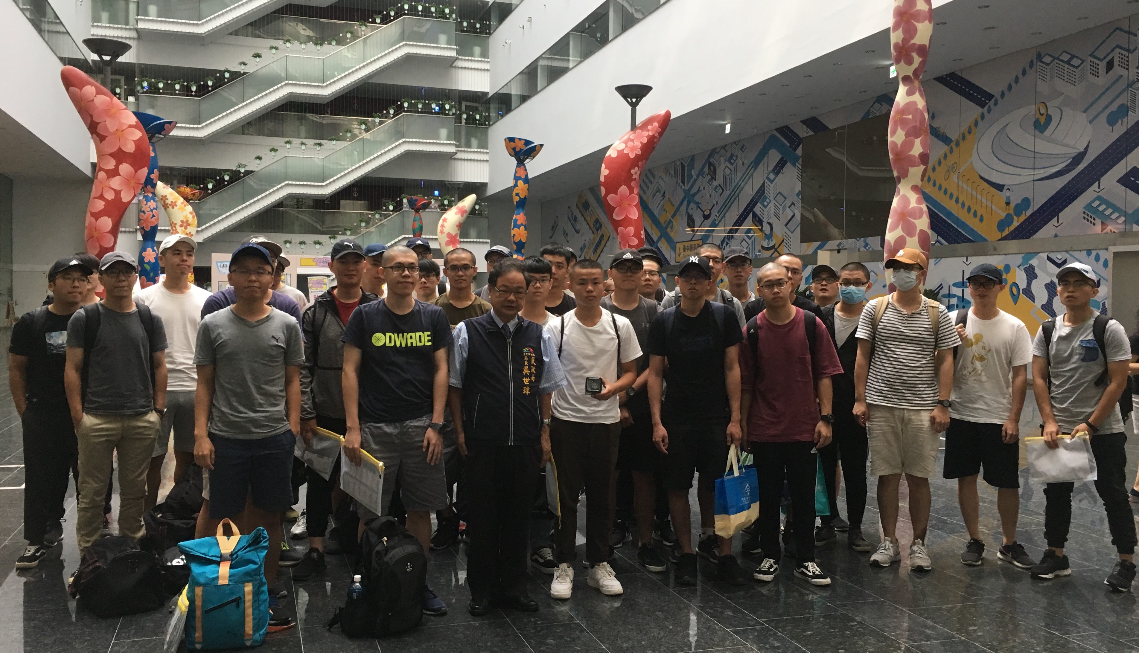 今(29)日台中市共有32名空軍第61梯次役男們至市政大樓集合等待入營,市府民政局長吳世瑋到現場探視這批即將入伍的空軍役男們,除了給予叮嚀祝福外,也贈送配合空軍軍種的白黑迷彩電子錶作為入營紀念,期盼役男們建立守時觀念。