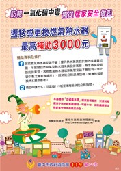 若民眾對家中熱水器安裝環境有疑慮時,可利用消防局「反碳風水師」的服務直接撥打「119」或詢問當地消防分隊,消防局會派員到民眾住家進行居家訪視,由消防員和民眾一同進行居家安全診斷,並在過程中提醒民眾防範一氧化碳中毒相關注意事項;另針對居家有一氧化碳中毒潛勢的場所,經轄區消防人員訪視並確認後,民眾可向消防局申請遷移或更換熱水器的部分金額補助。(8/30*18)*消防局