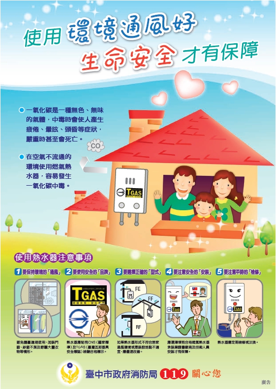 消防局提醒,民眾平時能以「五要」原則,自行檢視家中熱水器安裝位置是否安全,要保持環境的「通風」、要選擇合格的「標示」、要使用正確的「型式」、要注意安全的「安裝」及要注意平時的「檢修」,才能免於一氧化碳中毒的無形風險。