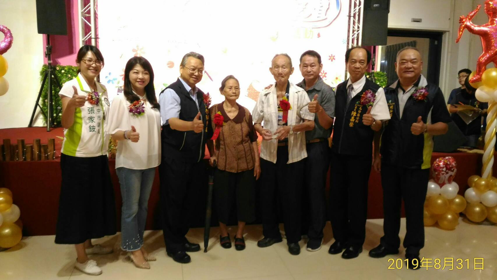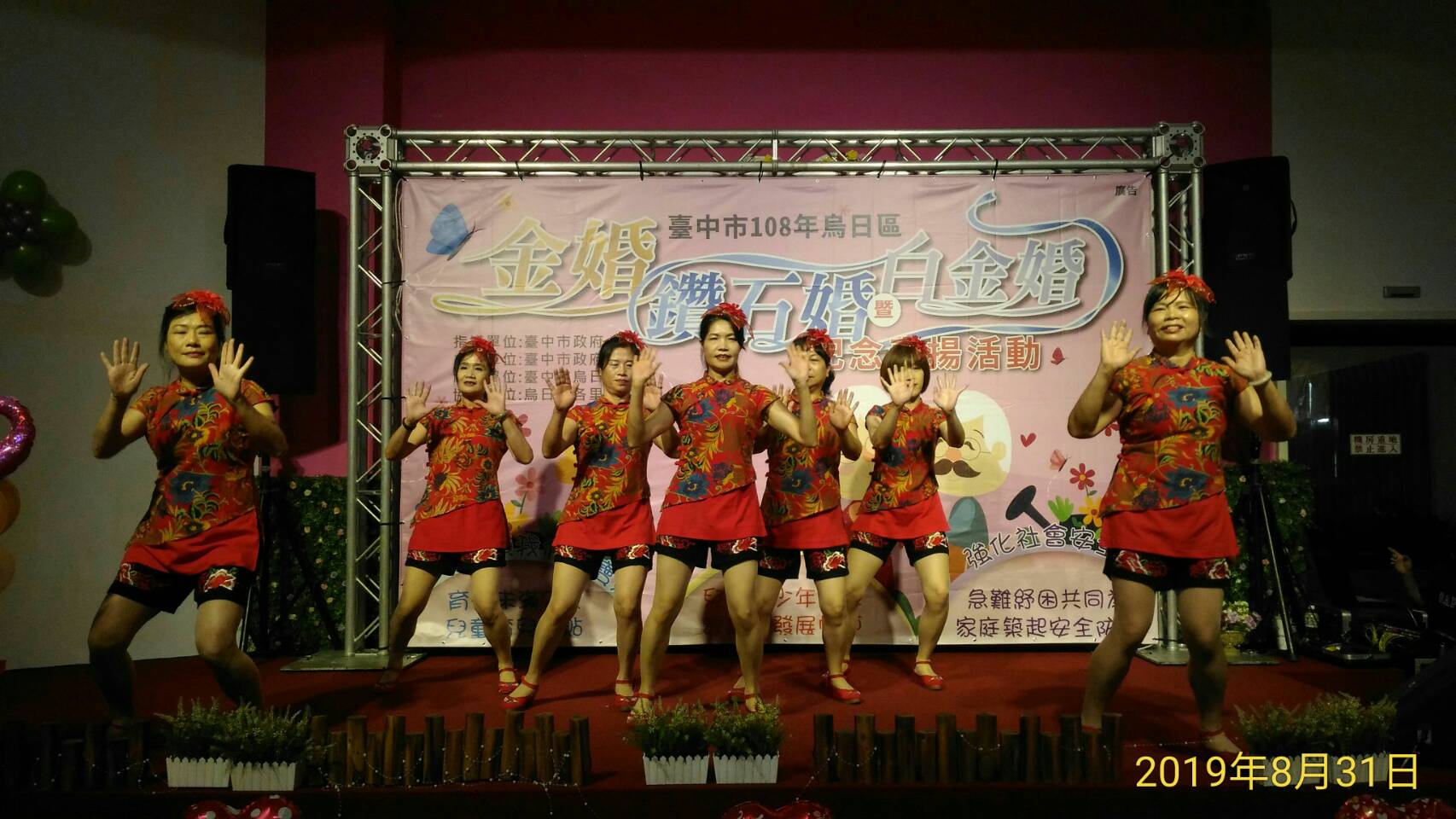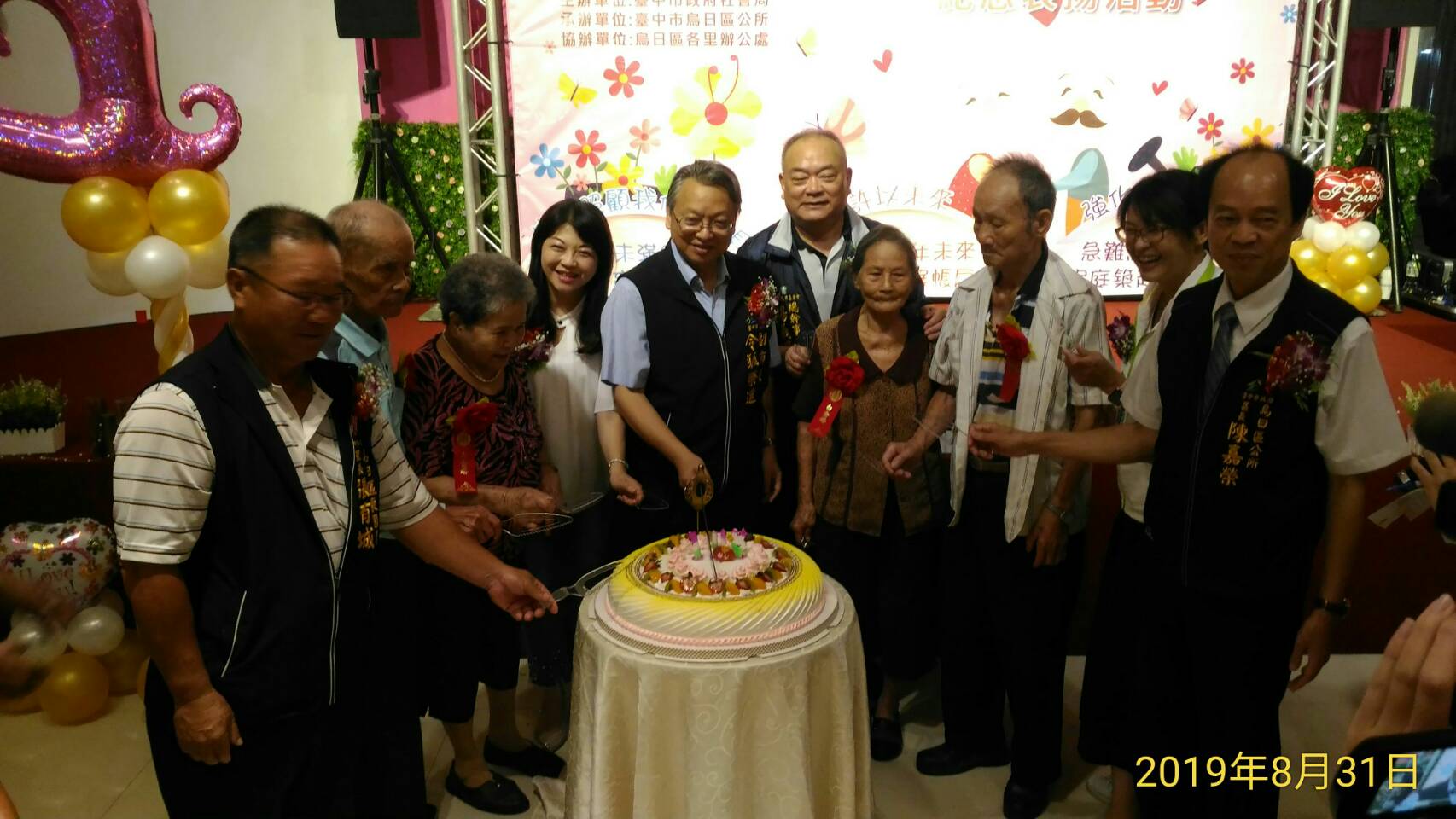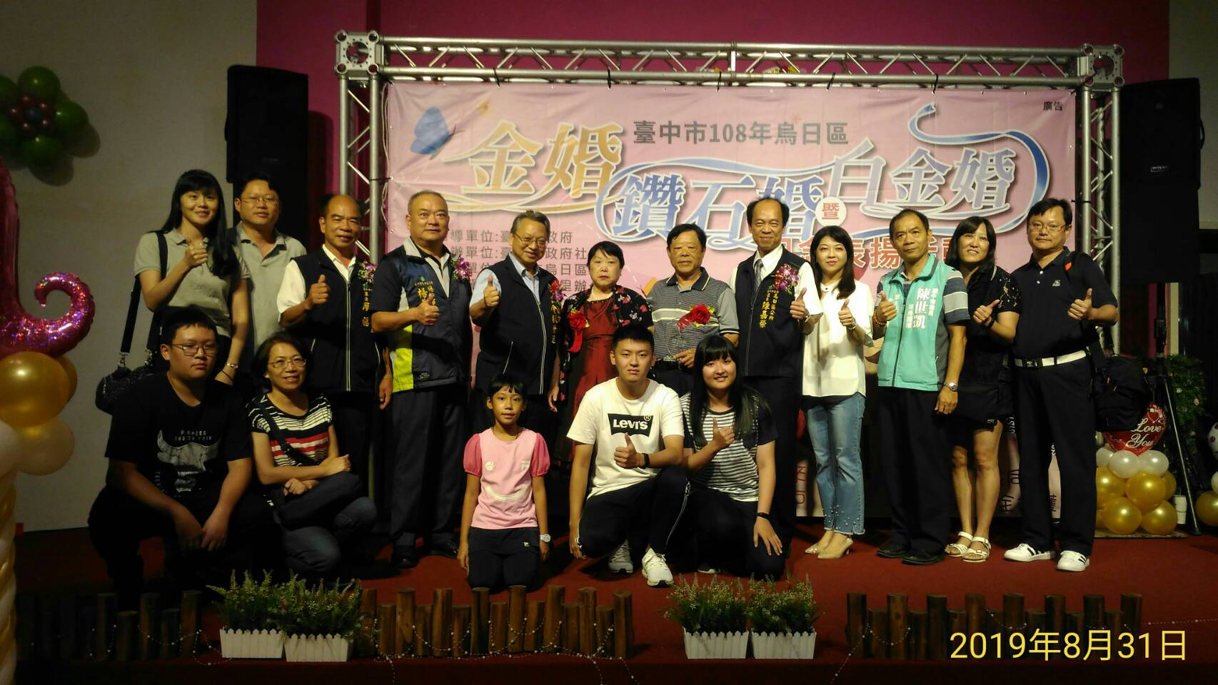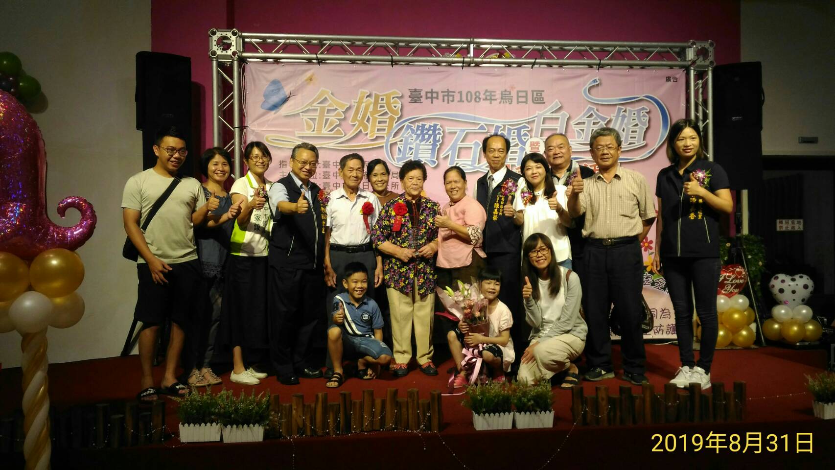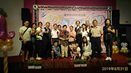 烏日區公所今(31)日舉辦108年金婚、鑽石婚暨白金婚紀念表揚活動,共63對恩愛數十年的夫妻攜手走過紅地毯接受表揚,台中市副市長令狐榮達代表市長盧秀燕出席,與每對夫婦合影並頒發獎牌,和現場嘉賓一同見證長輩堅貞不渝的愛情。