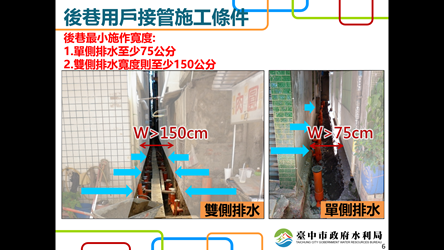 水利局呼籲,在獎勵期間,住戶只需要提供單側建物最小施作寬度為75 公分、雙側建物最小施作寬度為 150 公分即可免費接管,希望市民能配合與支持汙水建設,徹底改善後巷藏汙納垢環境,提升城市競爭力及居家生活品質,共同為河川水質盡一份力。(9/4*22)*水利局