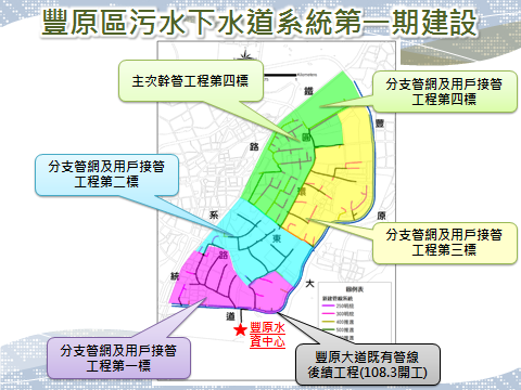 水利局表示,縣市合併前,原縣區汙水下水道主要建設於水源保護區,如石岡壩、梨山及環山等汙水下水道系統,現配合豐原水資源回收中心的完工,市府預計投入約15億元加速辦理豐原汙水下水道系統第一期建設。