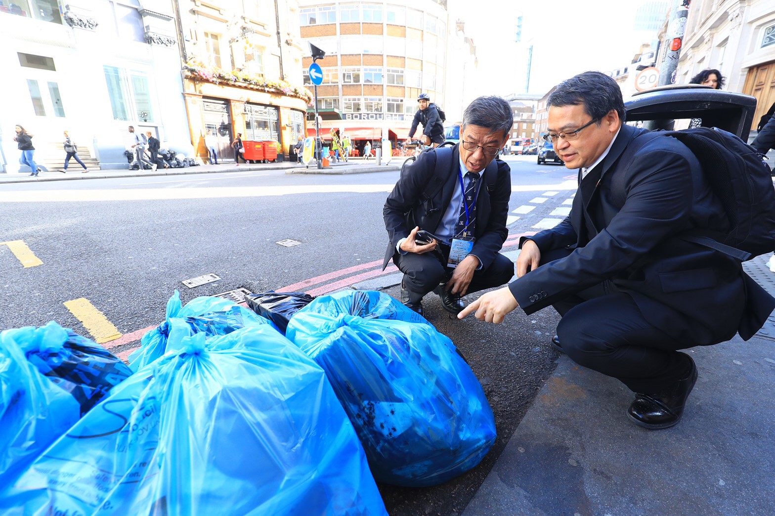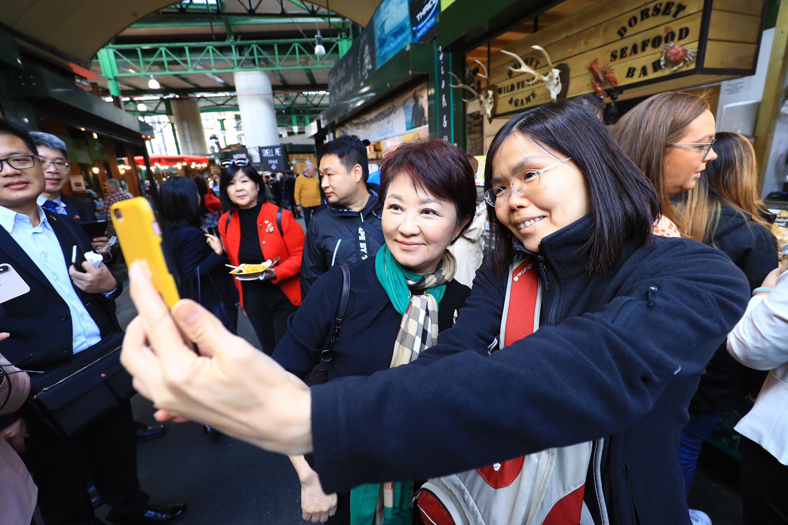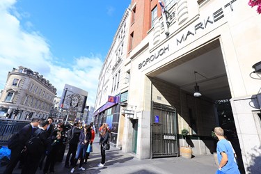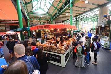 盧市長在英國波羅市場所屬導覽機構導覽經理莎拉巴特勒(Sara Butler)陪同下,參訪倫敦波羅市場(Borough Market),該市場為倫敦一個設置於高架橋下的古老市集,市場攤位以同類型商業進行分區,透過區域控管方式維持環境衛生,朝觀光市集方向發展。