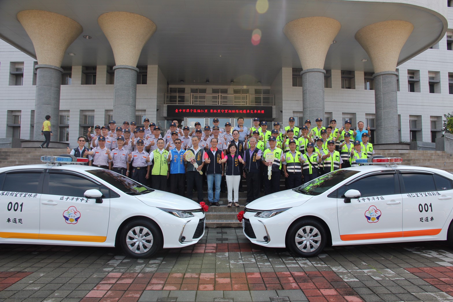 台中市潭子區福仁及栗林兩里守望相助隊巡邏汽車車齡將近15年,性能低落老舊且有安全疑慮,台中市政府民政局補助兩里守望相助隊各購置1台全新巡邏車。今(8)日在潭子區公所前廣場舉行交車儀式,由副市長楊瓊瓔將巡邏車輛交給守望相助隊,盼藉此強化執勤安全並提高巡守效能,守護當地社區治安。