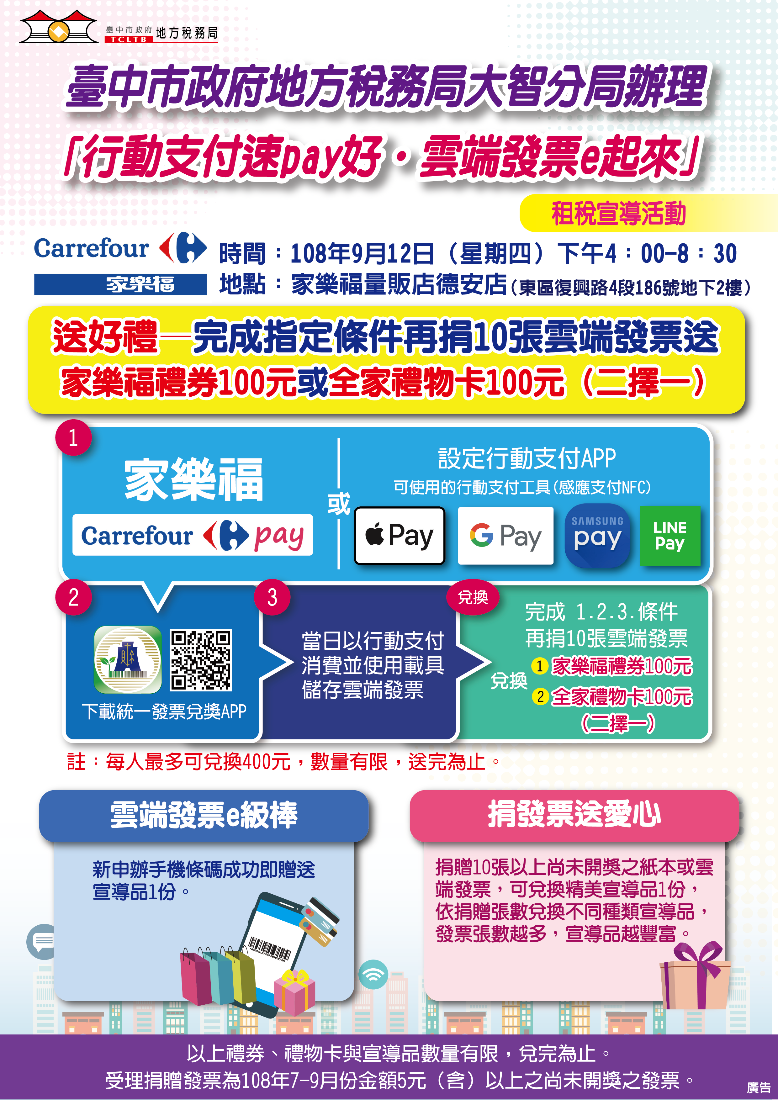 台中市政府地方稅務局大智分局為加強宣導行動支付結合雲端發票觀念,結合家福股份有限公司,將於9月12日下午4時至8時30分在台中家樂福量販店德安店舉辦「行動支付速pay好‧雲端發票e起來」租稅宣導活動,鼓勵並協助民眾購物時,以行動支付綁定手機條碼索取雲端發票。