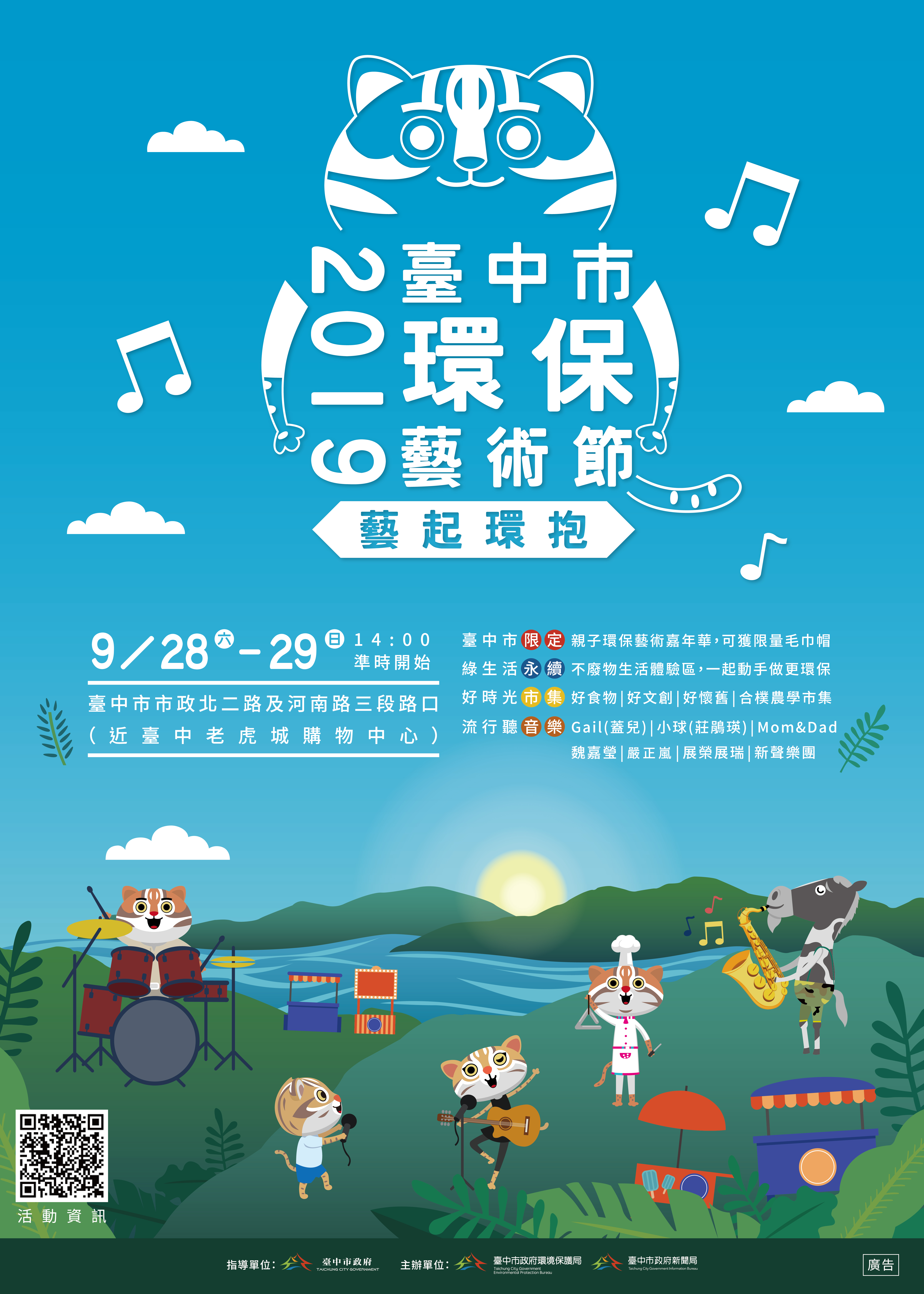 活動現場安排goodmoment市集、不廢物生活體驗、花草系Dress Code Party、環保藝術親子嘉年華等,並邀請台中石虎家族吉祥物自創舞蹈帶動跳。詳細活動資訊及活動形象宣傳影片可至臉書專頁「台中好環保」(https://www.facebook.com/recycle.tcepb)查詢。(9/11*23)*新聞局