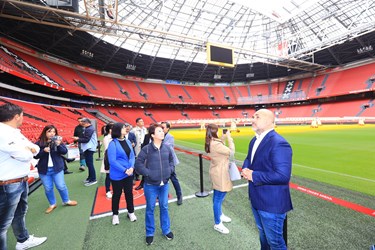 盧市長一行人首先參訪荷蘭阿姆斯特丹創新體育館,足球比賽大約可容納52,000人,配合阿姆斯特丹的智慧城市願景,將自身改造成為全世界最創新的體育場,屋頂上裝載 4200 片的太陽能板,並設置全歐洲最大的商業儲電系統,體育館變身都市綠能供應站。