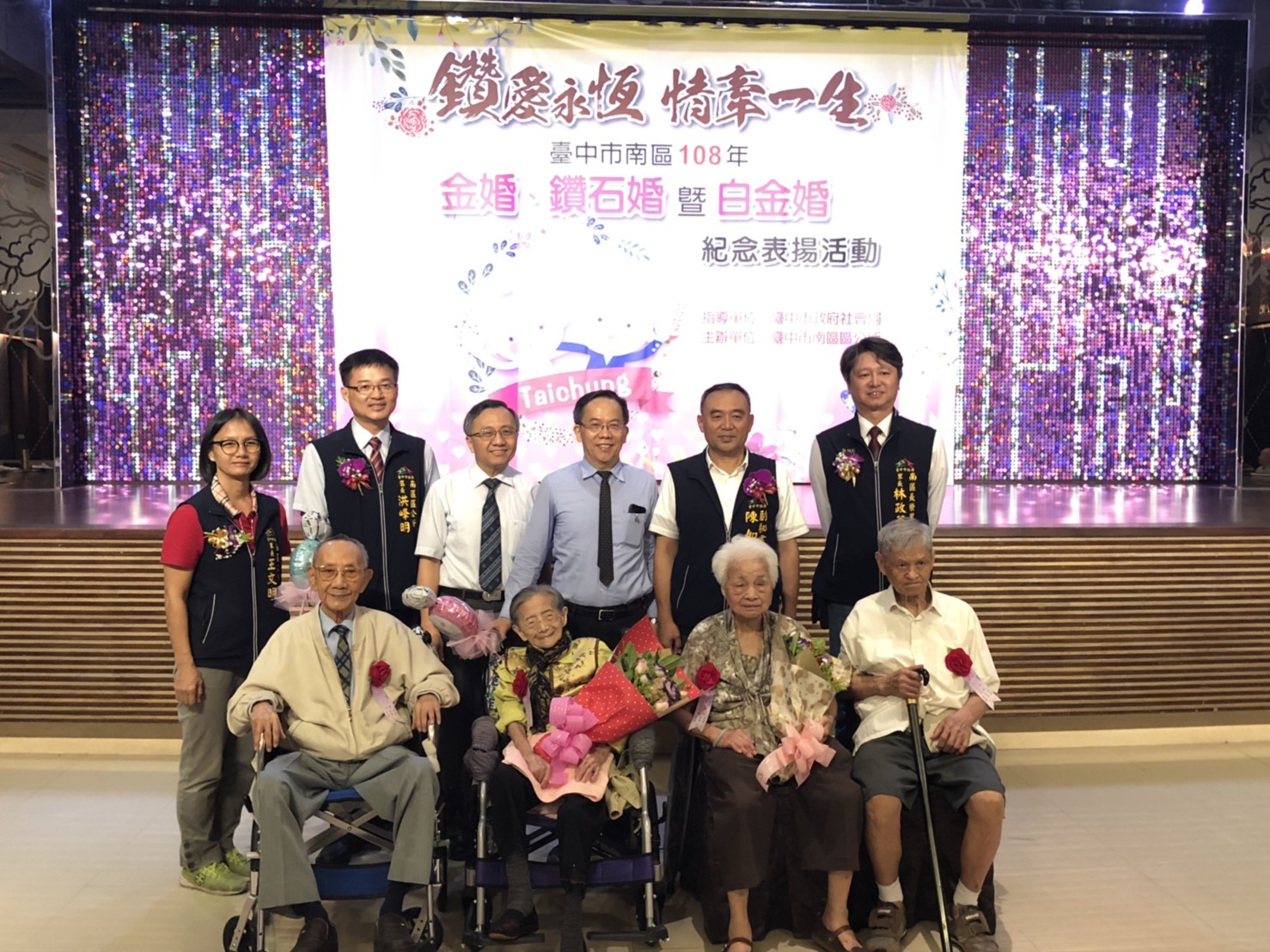 台中市南區區公所今(12)日舉辦「108年度金婚、鑽石婚暨白金婚紀念表揚活動」,由市府副秘書長陳如昌代表市長盧秀燕頒贈紀念獎牌,向伉儷們表達祝福。
