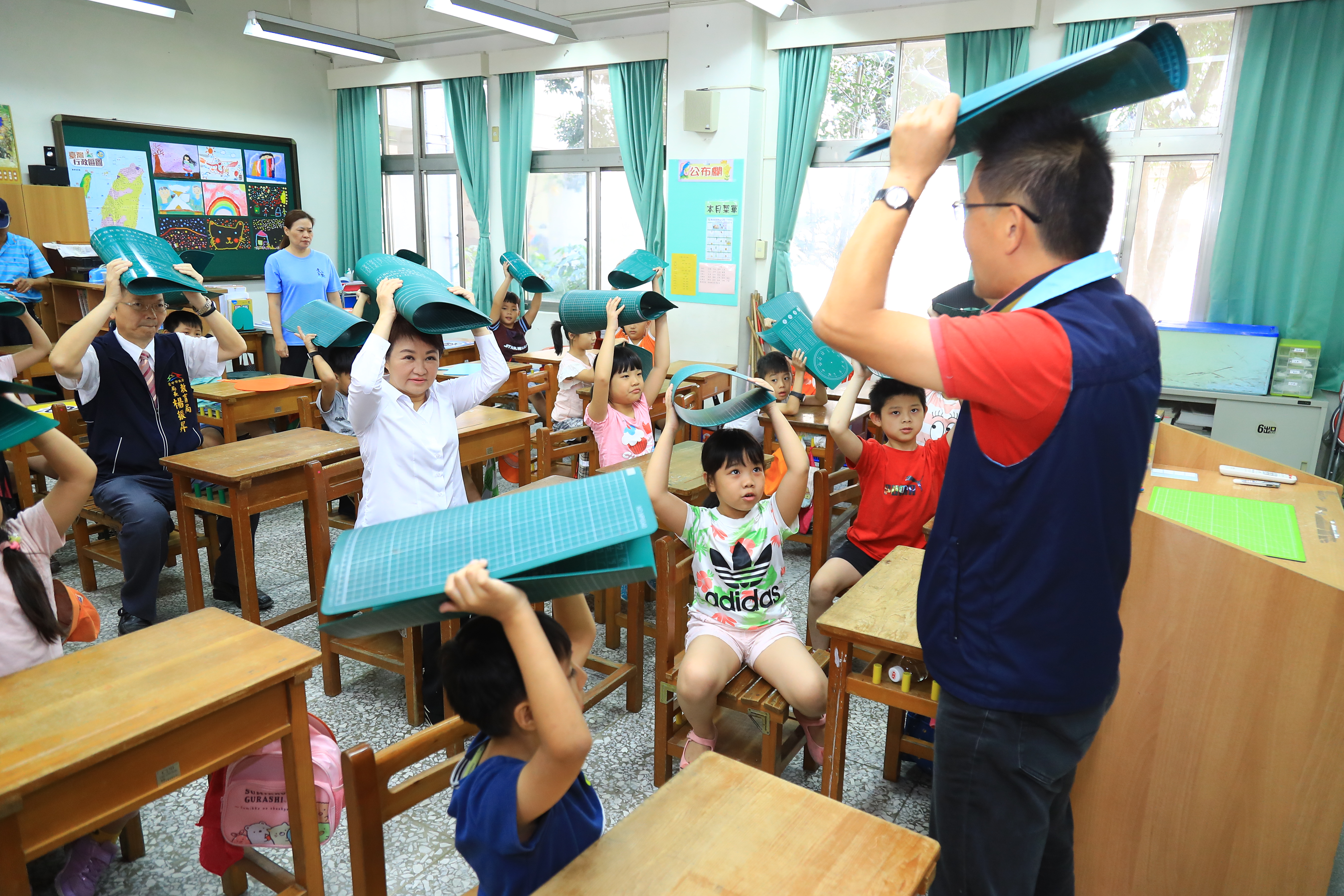 「多一分準備,少一分傷害。」盧市長今日演練時表示,921地震今年20周年,當年台中傷亡嚴重,市府今日起舉行一連串的避難演習及紀念感恩活動,教導小朋友正確的口訣與要領,提醒市民平時仍應保持憂患意識,透過實際操練,落實自我保護,市府也會持續加強防災建設,打造台中成為安全快樂的城市。