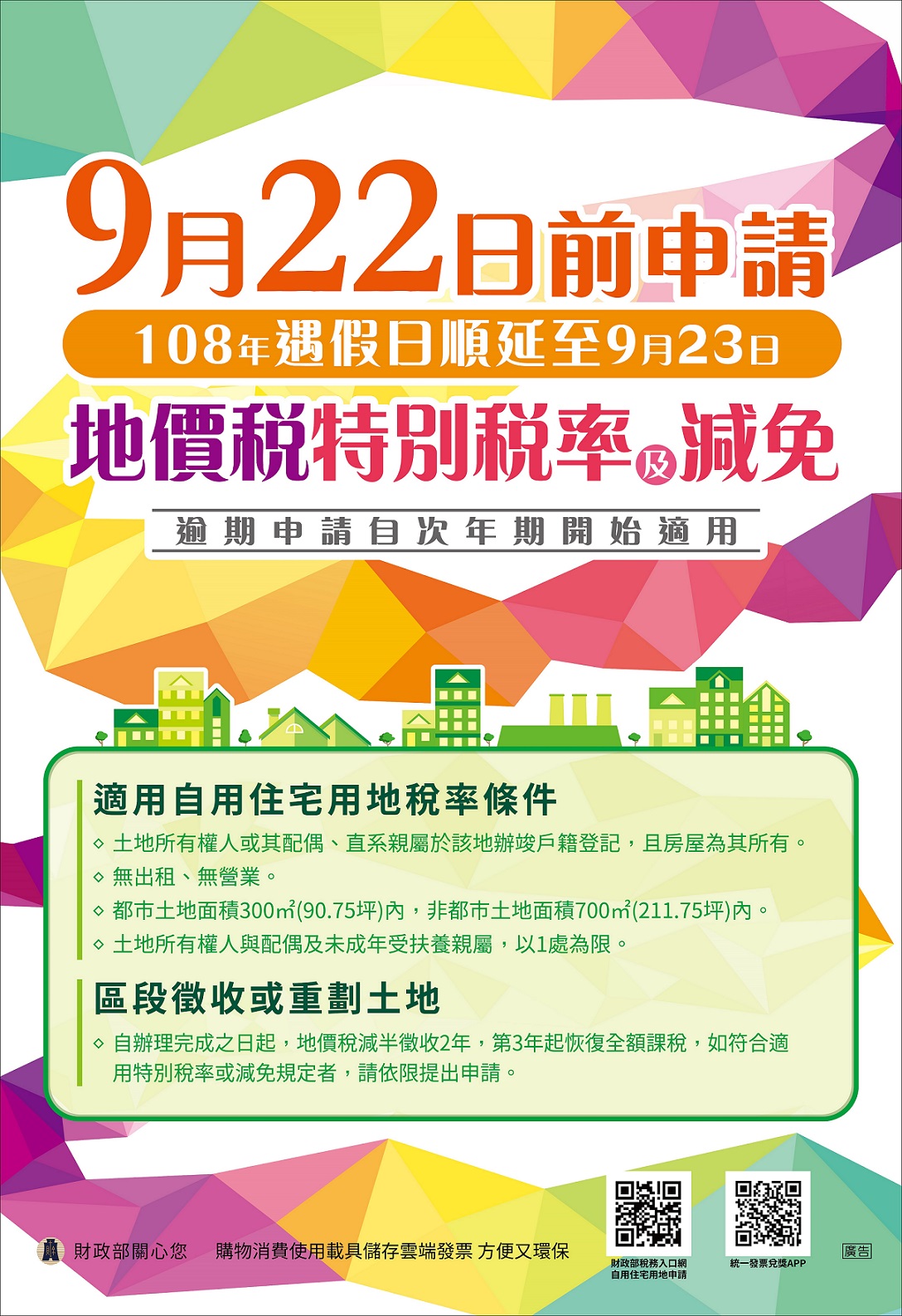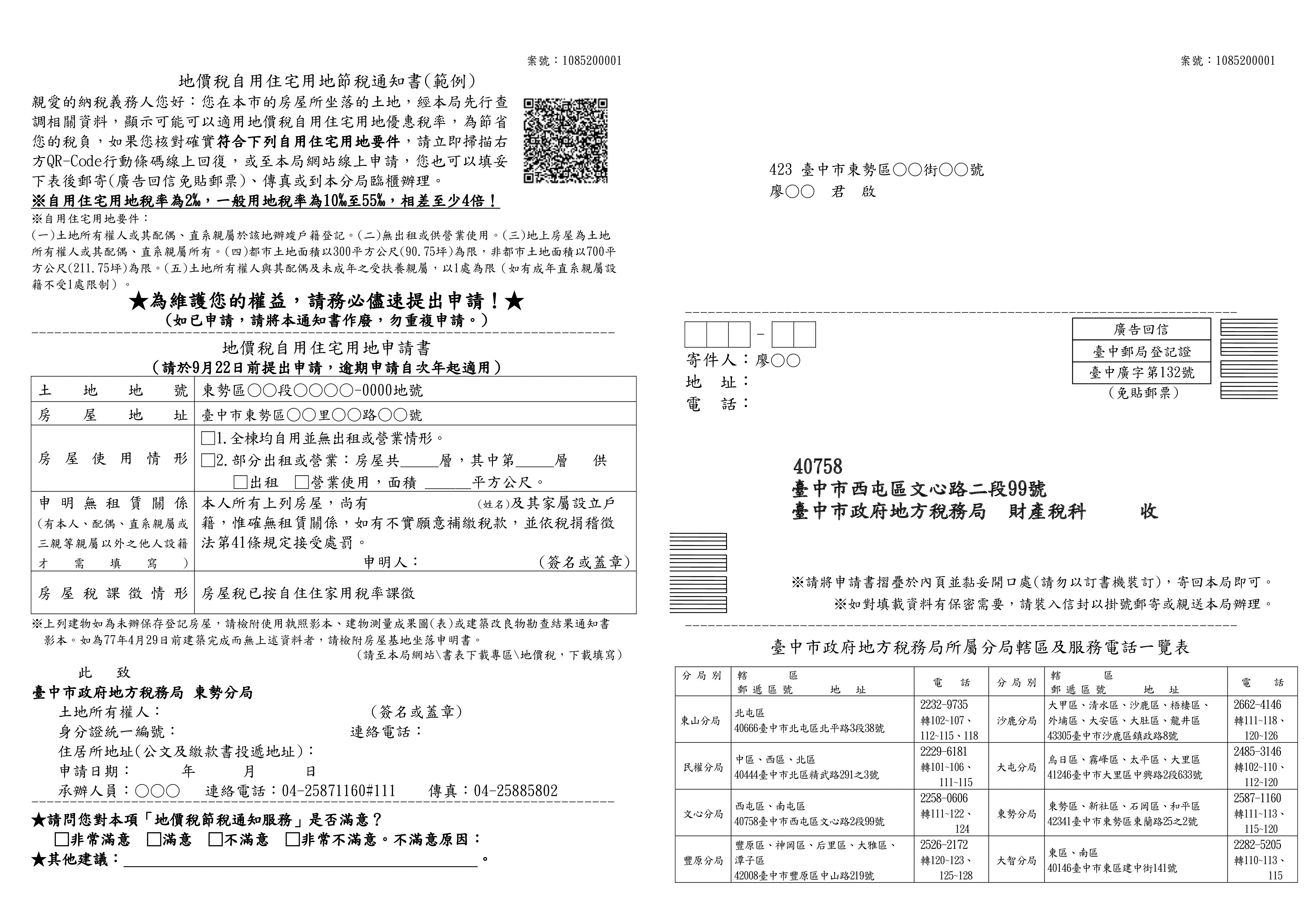 台中市政府地方稅務局主動篩選符合地價稅自用住宅用地稅率的納稅義務人,寄發節稅通知書,民眾可掃描節稅通知書上的QR Code線上申請,也可直接填寫基本資料寄回稅務局申請,或可利用傳真或臨櫃辦理,收到通知書或符合資格的民眾請於9月23日前提出申請。