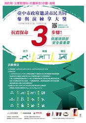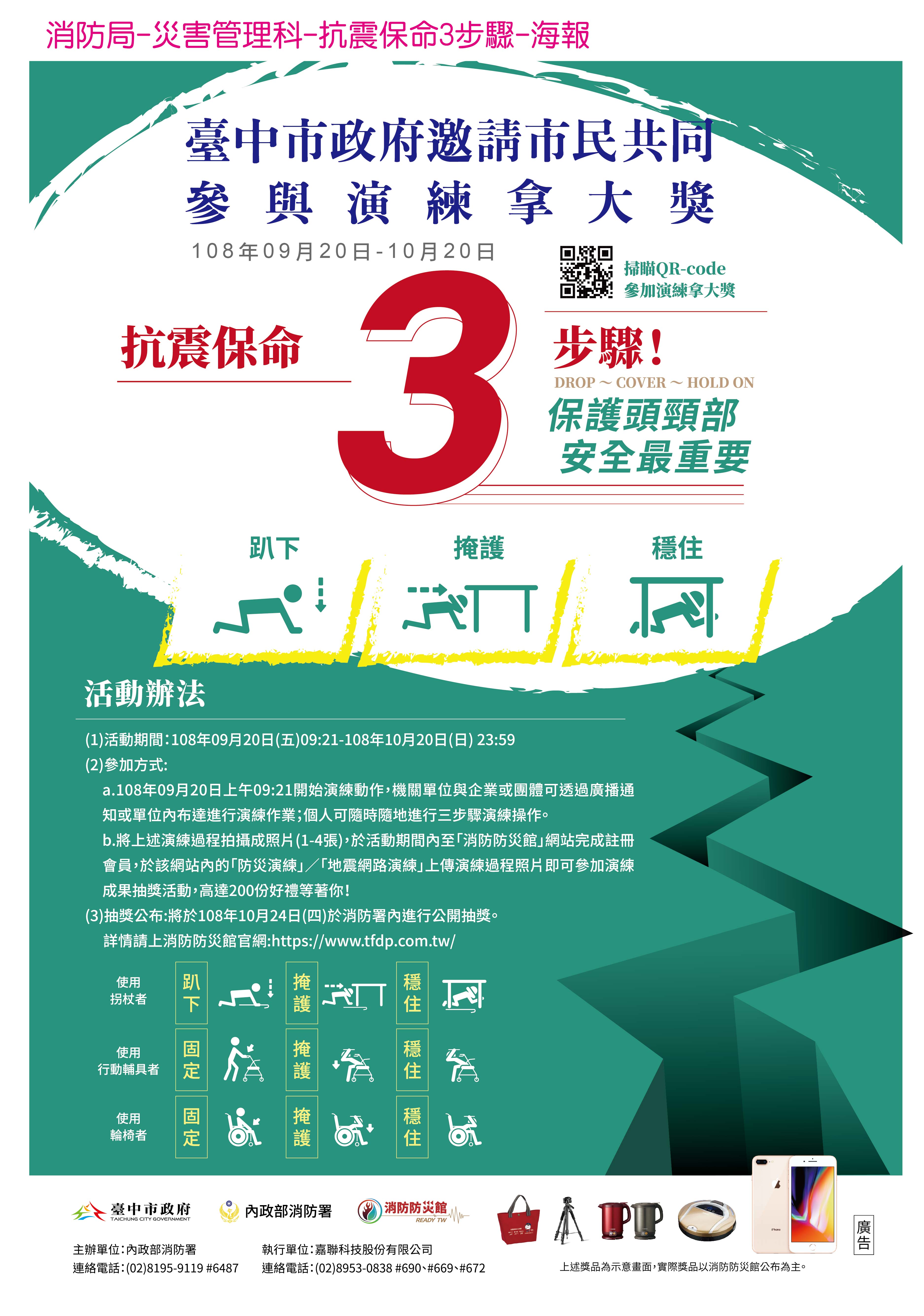 每年9月21日為「國家防災日」,為鼓勵全民參與地震避難演練,台中市政府消防局邀請市民共同參與演練拿大獎,即日起至10月20日,民眾演練「抗震保命3步驟」: 趴下、掩護、穩住,將演練過程拍照,於活動期間內上傳演練照片至消防防災館網站,將有機會獲得智慧型手機、掃地機器人等多項好禮。