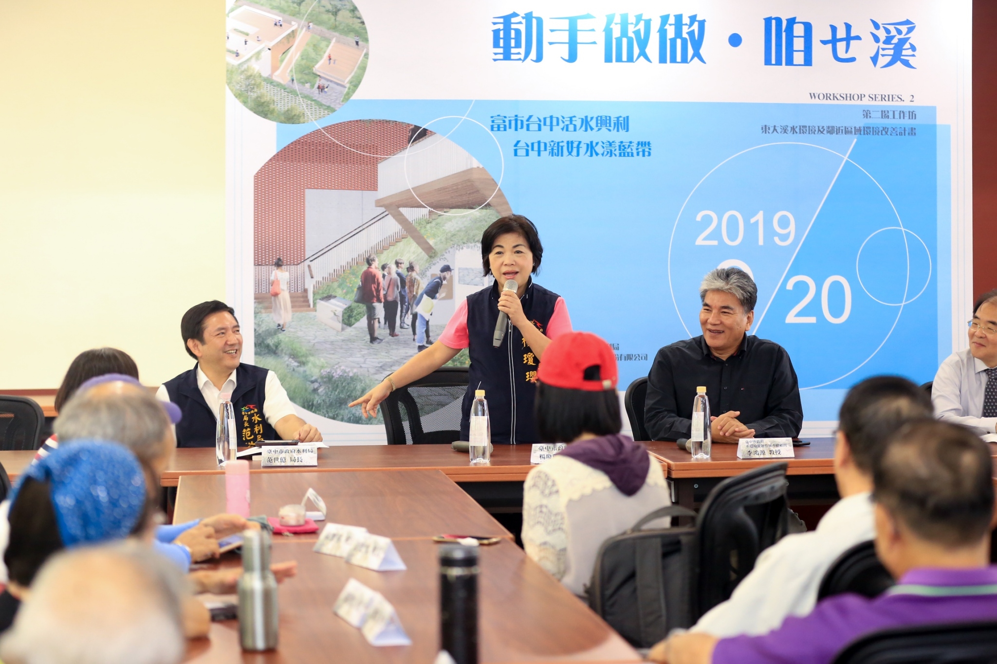 台中市政府水利局今日於東海大學圖書館舉辦「動手做做‧咱ㄝ溪」工作坊,由副市長楊瓊瓔主持,包括前內政部長同時也是台中市水環境及韌性城市總顧問李鴻源、水利局長范世億、東海大學副校長王立志、東海大學研發長林惠真、多位退休地方校長、里長、志工與關注此案NGO團體、東海大學學生會、東海大學教師會等成員,現場踏勘並進行分組動手實作,關心東大溪沿岸生態景觀。(9/20*14)*水利局