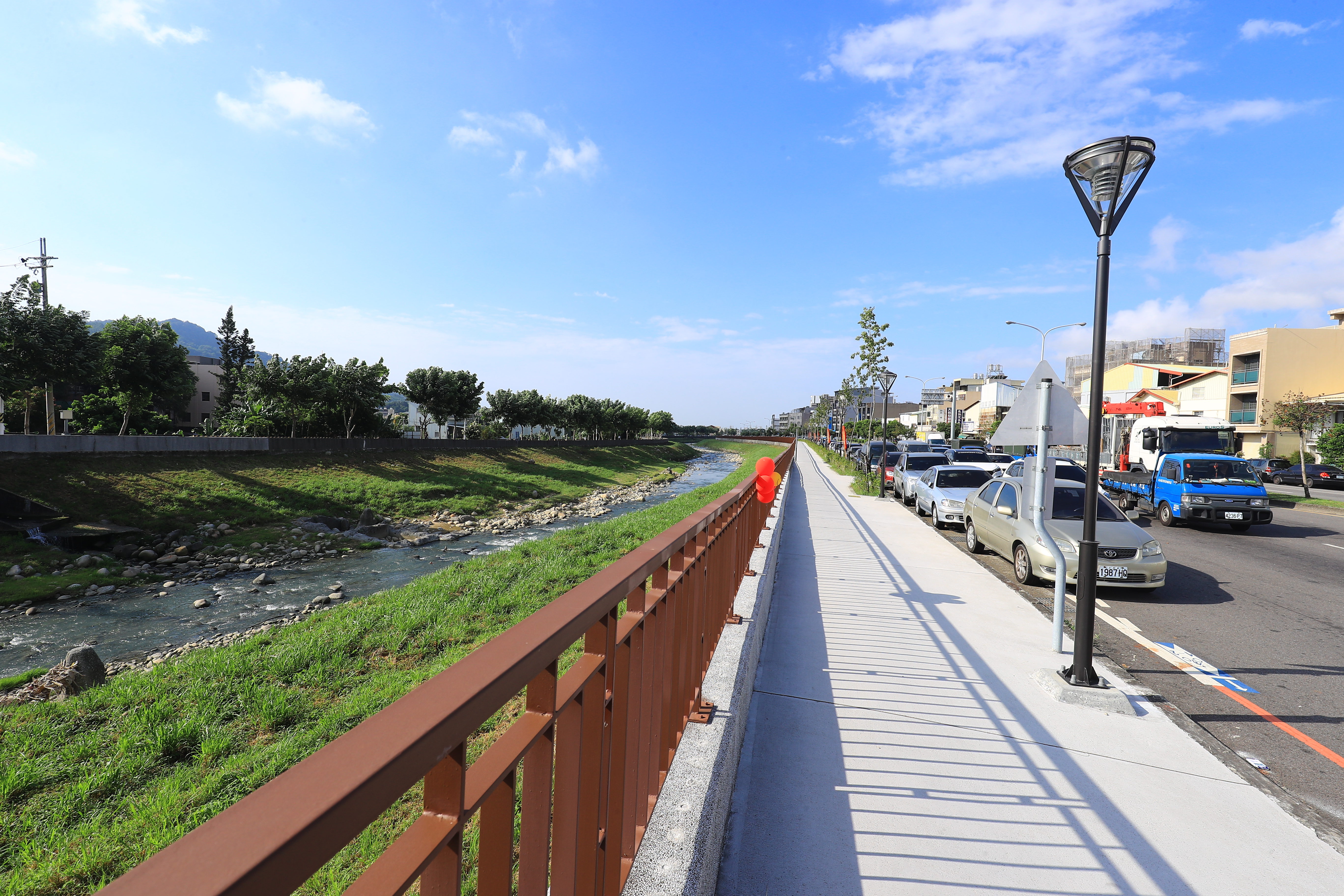 台中旱溪河岸人行道與自行車道興建年代已久,有老舊破損等問題,對此,台中市政府建設局推動美化工程,「人車雙道都改善!」,第一期豐原區南陽橋至金谿橋間西岸改善花半年時間,今年7月完工。市長盧秀燕今(20)日到場視察,肯定成果,「過去髒亂點,現在新亮點」。