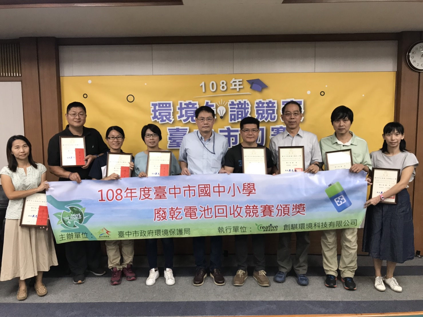 台中市政府為提升全民廢乾電池回收的觀念和知識,舉辦國中小學廢乾電池回收競賽,鼓勵孩童身體力行實踐回收愛地球行動,吸引35所國民中小學、1萬5,503位師生參加,共回收約3,419公斤,大幅提高廢電池回收率。環保局今(22)日在逢甲大學頒獎,肯定表現特優學校,期勉各校持續推動廢乾電池回收。