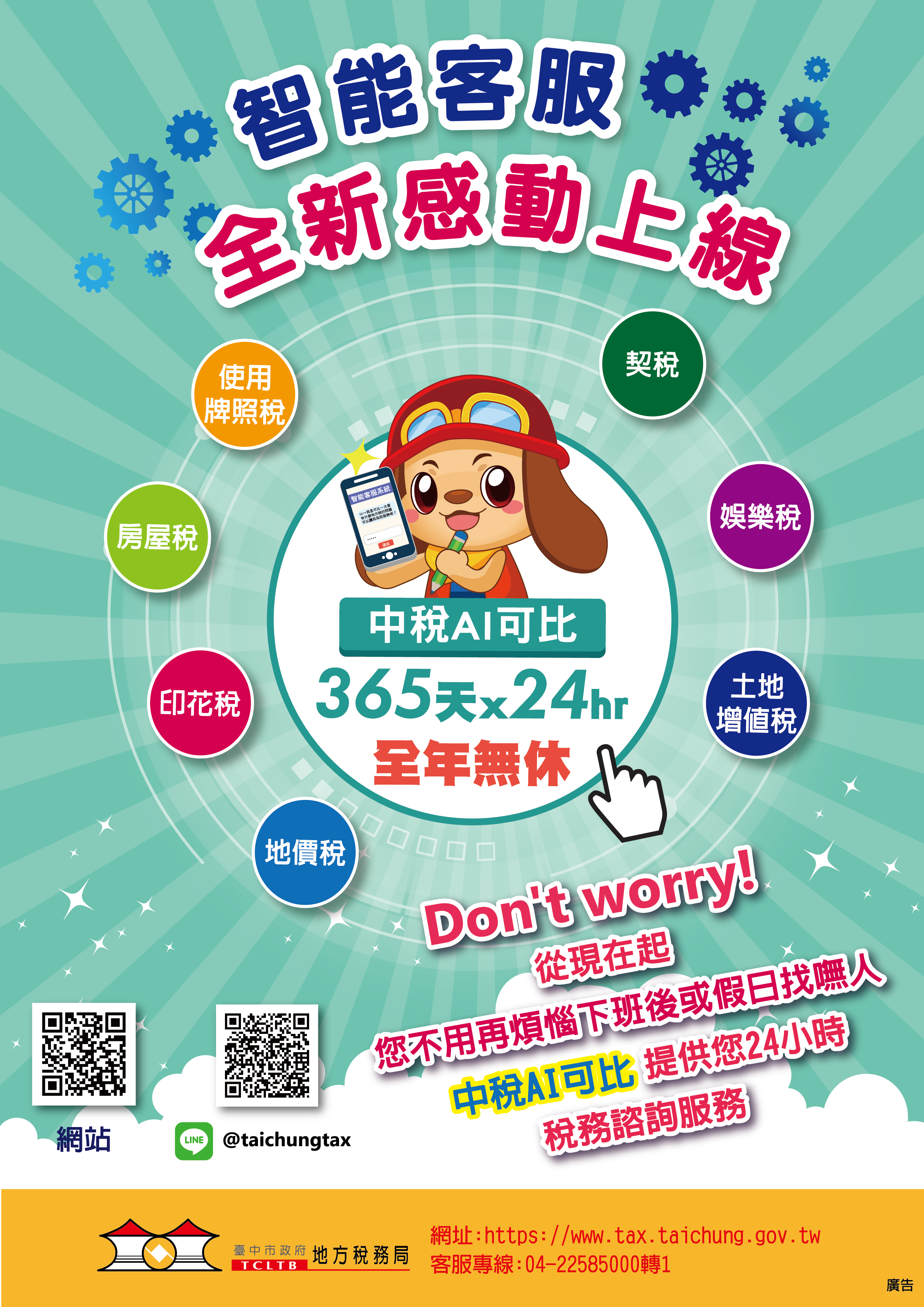 稅務局說明,只要登入「中稅AI可比」,即可以聊天方式詢問房屋稅、地價稅、使用牌照稅、土地增值稅、契稅、娛樂稅、印花稅等各項地方稅的問題,如有任何疑問,可撥打0800-000321免付費電話,或04-22585000按1接電話客服中心洽詢。(9/23*14)*地方稅務局