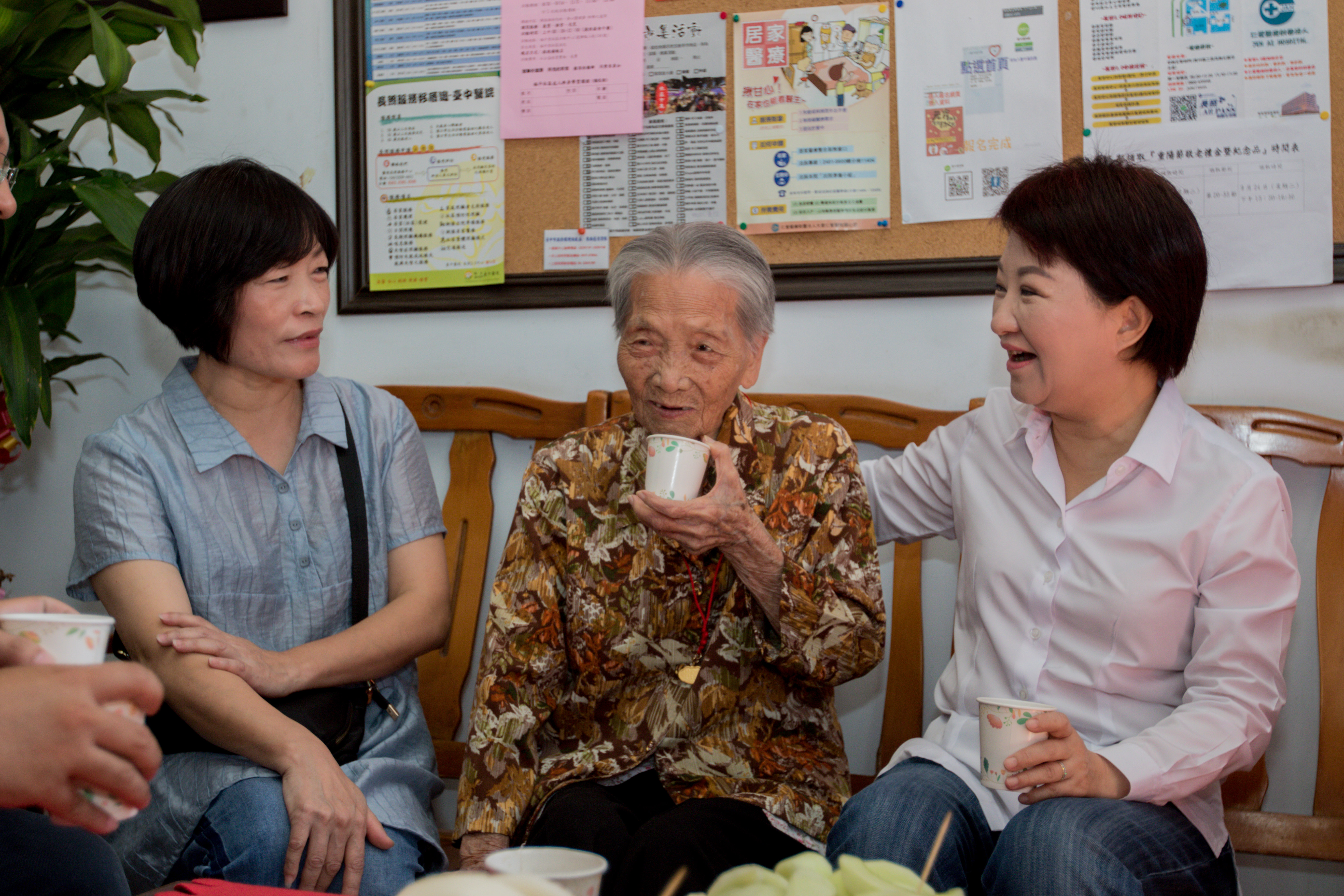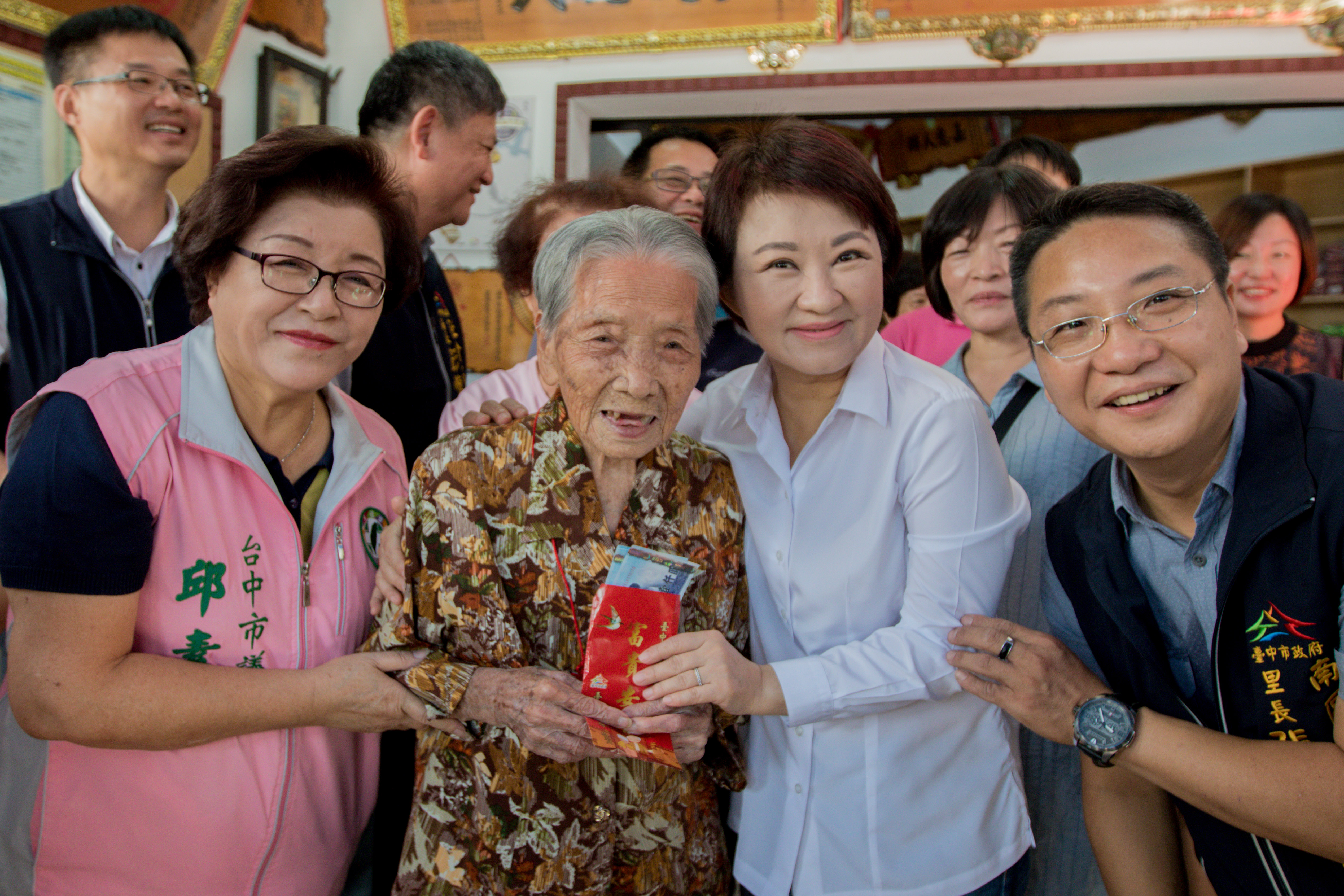 「台中市好福氣!」盧市長表示,台中市有284位長輩超過100歲,65歲以上長輩超過35萬人,都是台中的寶貝,我們珍惜他們、以他們為榮,重陽節快到了,今天特別來探望他們,也代表市府及市民致贈禮金;超過100歲的長輩,市府都致贈1萬元禮金,祝福阿公阿嬤們身體健康、心情愉快、家庭幸福美滿。