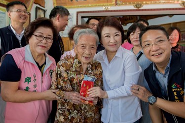 重陽節將至,市長盧秀燕今(25)日前往南區拜訪103歲人瑞江宋鋏妹奶奶,致贈市府重陽敬老禮金1萬元,並轉贈中央金鎖片等賀禮。「阿嬤很酷!」盧市長牽著江宋奶奶的手說,阿嬤耳聰目明、身體健康、精神愉快,現在還是會每天搭公車到市場買自己喜歡的食物;「阿嬤妳放心!」她也承諾,未來這幾年市府會努力將台中市公車改善為「低底盤」,讓長輩及行動不便的民眾方便上下車。