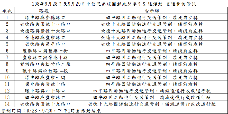 運動局表示,管制時間從賽事當日下午1時起至活動結束人員撤離止;管制範圍包括環中路、四平路、豐樂路、昌平路及松竹路二段等部份道路(詳細管制點請參考附件照片)。