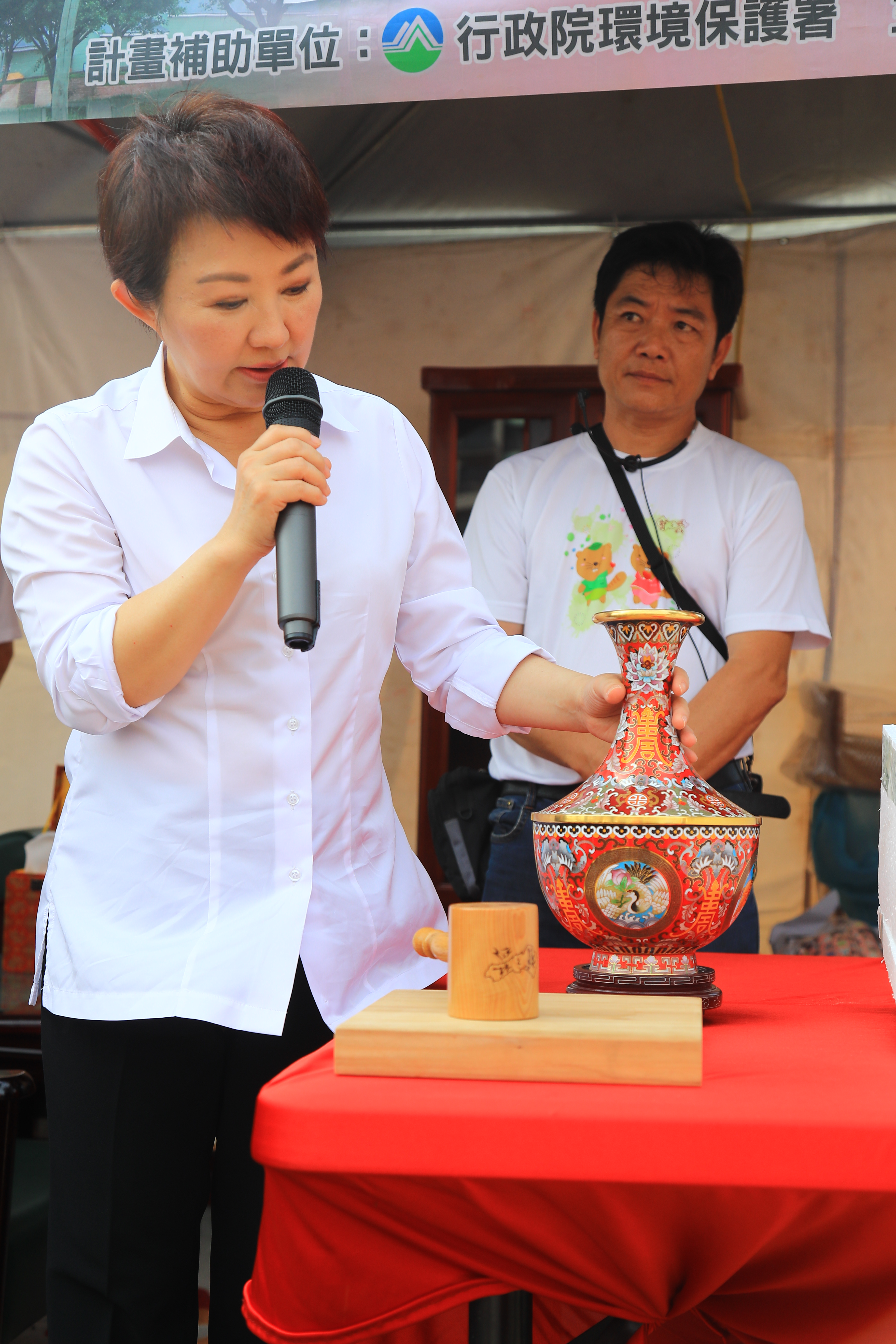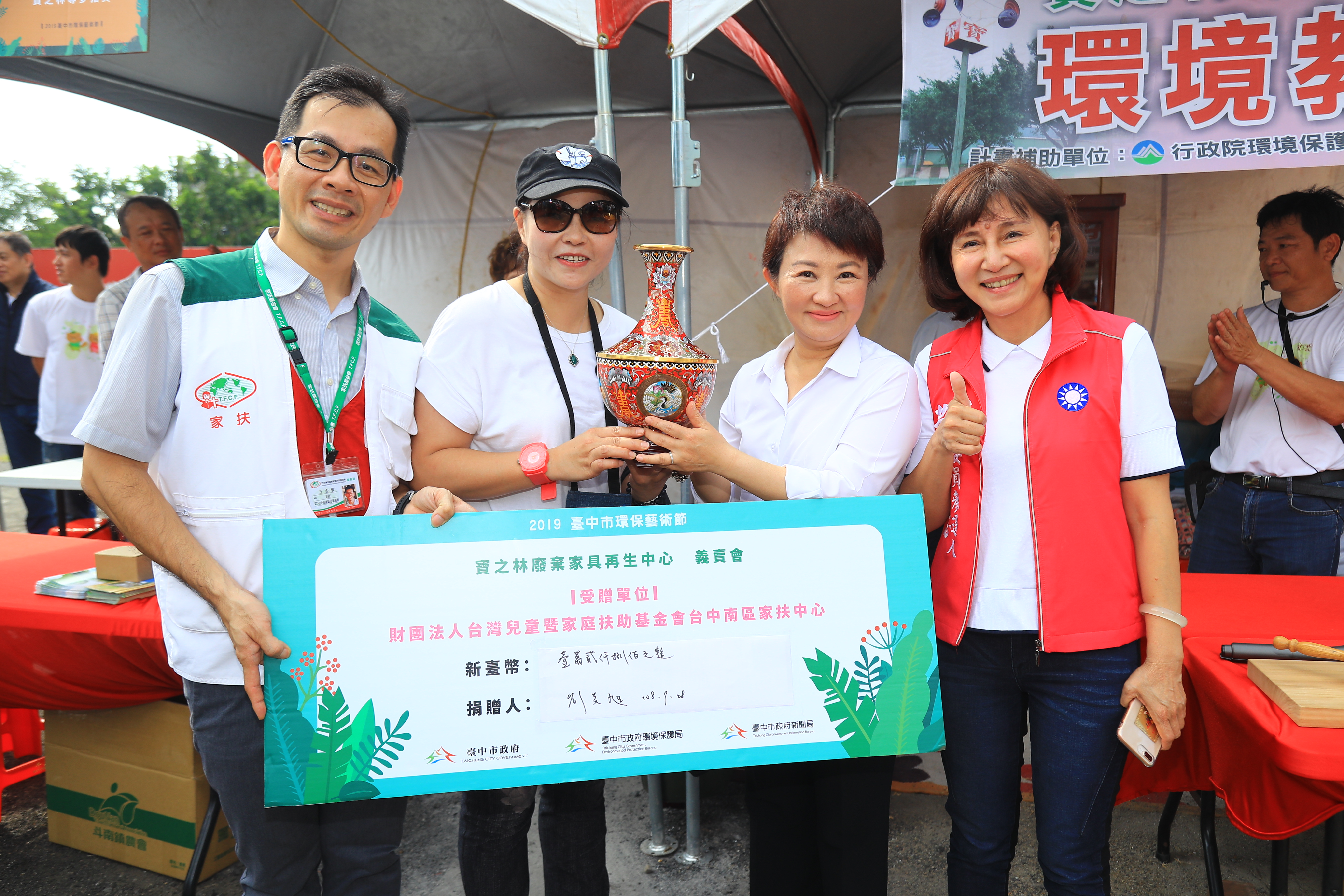環保局旗下「寶之林廢棄家具再生中心」也在現場舉辦再生家具義賣會,盧市長再化身拍賣官,拍賣再生家具,其中一件木桌子由4塊椅子組合而成,盧市長用超溜口才滔滔不絕說著木桌優點,「併起來變桌子、分開變椅子,還可放擺飾、打電腦,材質又好,用了就很有氣質,趕快帶回家!」,吸引不少民眾喊價。除了木桌,盧市長也帶了自己的花瓶、茶具組拍賣,約20分鐘就賣了近3萬元,義賣所得將全數捐贈財團法人兒童暨家庭扶助基金會台中市南區分事務所。