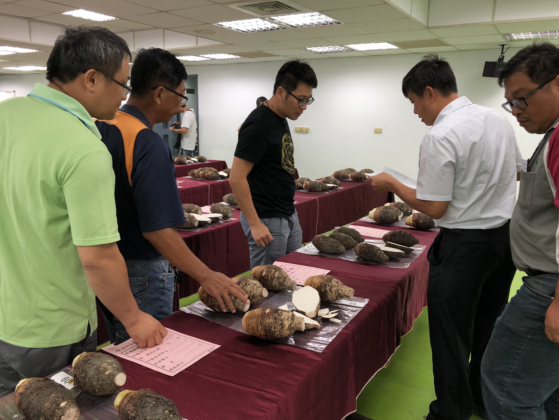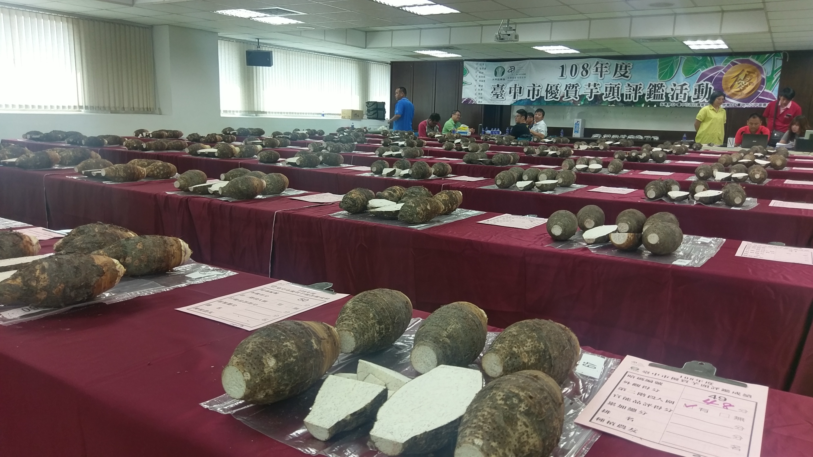 台中市政府農業局為提升台中芋頭栽培管理技術及品質,輔導大甲區農會昨(4)日在大甲農會本會大樓舉辦「108年度台中市優質芋頭評鑑活動」,計60組產銷班農民報名參加,最後由大甲區農友許欽龍榮獲第一名,奪下今年度的芋頭王殊榮。