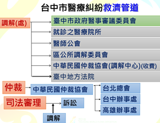 醫療糾紛發生時,病方常因缺乏相關專業知識處於不利地位,而醫方亦須面對相當大的心理壓力,為避免雙方花費過多時間及金錢於不必要的訴訟,台中市政府衛生局說明,民眾可先向就診醫療院所進行溝通調處,此外,台中市西、中、牙醫師公會、各區區公所調解委員會及衛生局都有提供醫療糾紛調處服務。