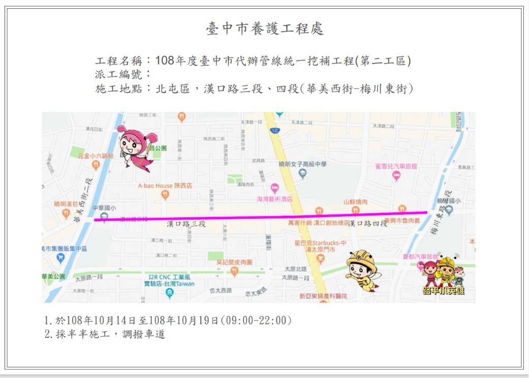 建設局為此進行梅川東路至華美西街燙平工程,總長約1.3公里,「採半半施工調撥車道方式(一半施工、一半開放通行)」,施工路段周邊均設置大型施工警告標誌、指示標誌及通知警察廣播電台等方式宣導,施工期間造成民眾交通及鄰近商家不便之處敬請見諒。