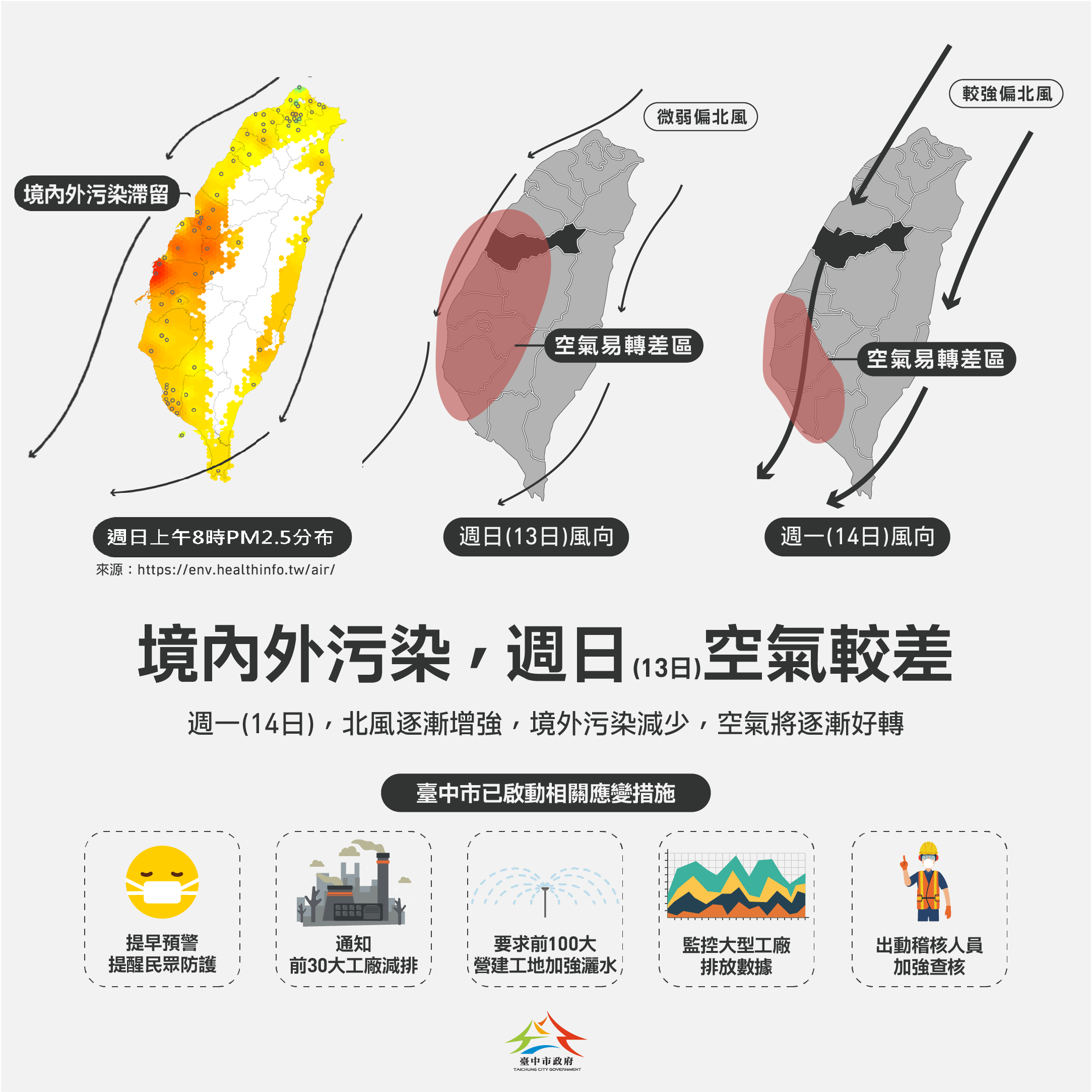 依據環保署空品資訊,今(13)日台灣西半部受境外及本土汙染物累積效應,空品持續不良為「橘色提醒」,市府持續啟動應變措施及加強監控,也請民眾注意自我防護,預計明日東北季風南下空品可獲改善,同時溫度將下降3至5度,提醒民眾加強保暖。