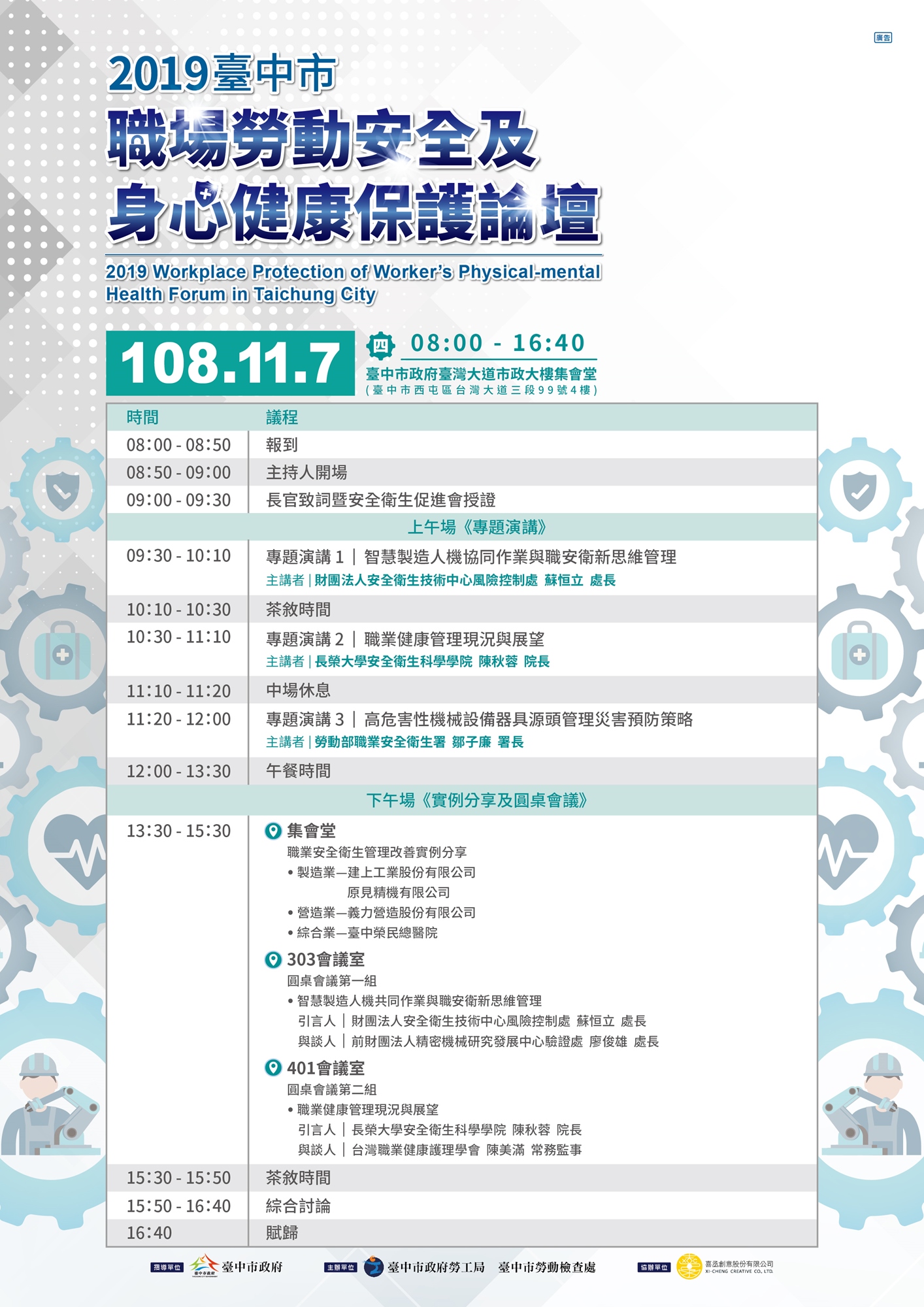 「2019台中市職場勞動安全及身心健康保護論壇」將於11月7日在台灣大道市政大樓4樓集會堂舉行,活動聚焦產業智慧化及人機共同作業職場環境,邀請相關領域專家進行專題講座及產、官、學、研多方合作討論,研議改善職場環境對策,並推動職場勞動者身心安全及健康保護服務,打造安全健康工作環境,歡迎民眾或事業單位踴躍報名。