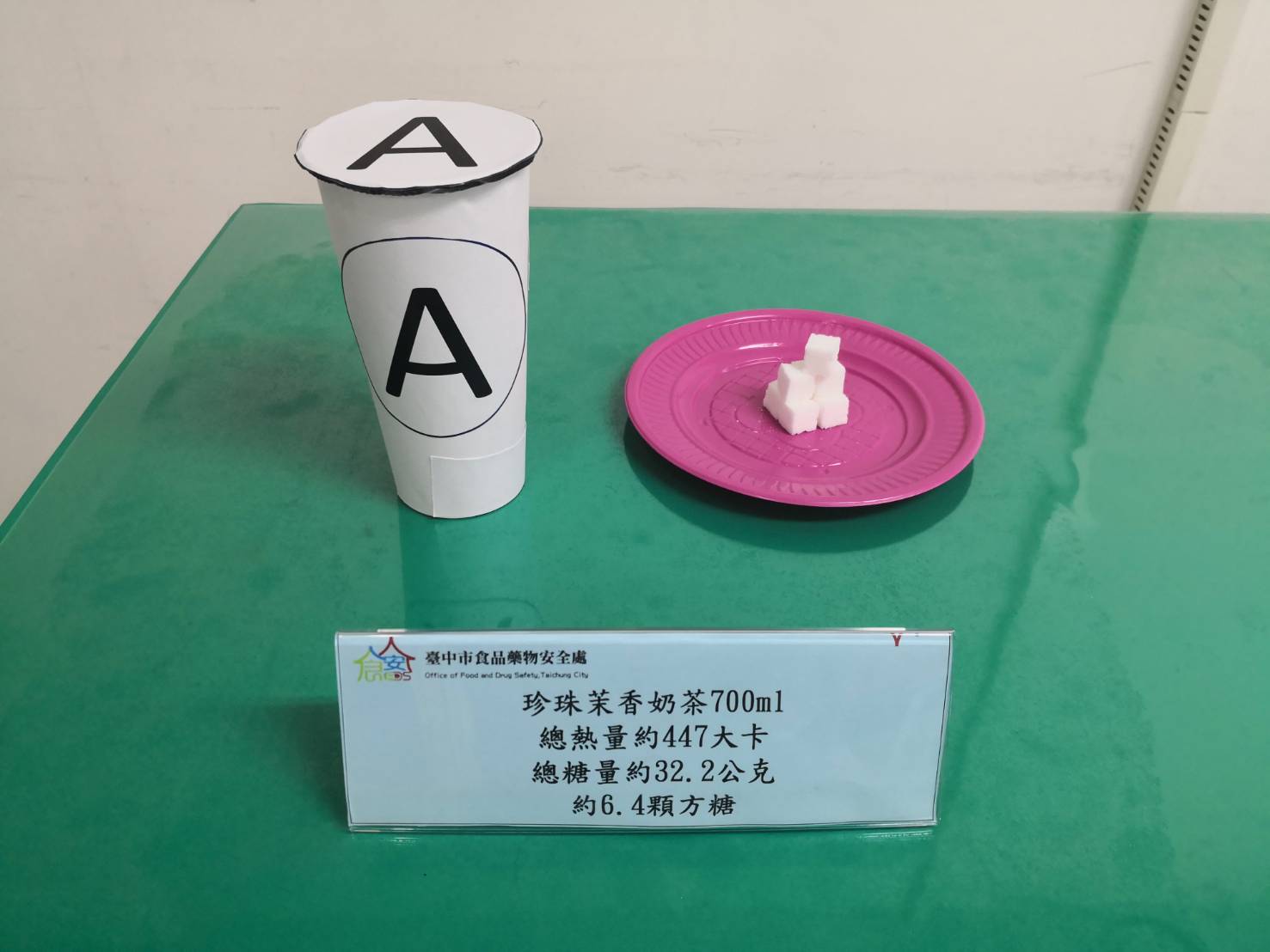 食安處表示,8月時進行台中市手搖茶飲茶葉抽驗,共抽驗30件,檢測374種農藥品項,結果全數符合規定;另外,也抽驗市售全糖珍珠奶茶4件並分析成分,每杯700 c.c珍珠奶茶含糖量介於32.2至78.4公克,喝完一杯700c.c珍奶等於吃下6.4至15.7顆方糖量,熱量高達450至500大卡。