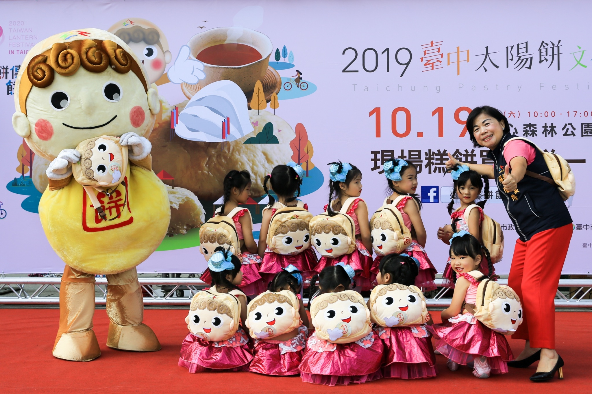 以太陽餅漩渦狀餅皮及糕餅印紅字特徵設計的「餅寶貝」背包今日也搶先亮相,Q版、討喜模樣引發廣大迴響,楊副市長與現場大小朋友一起背上「餅寶貝」背包,直呼可愛,並走訪各攤糕餅業者,品嚐糕餅美味,大讚台中糕餅「甜甜蜜蜜!」