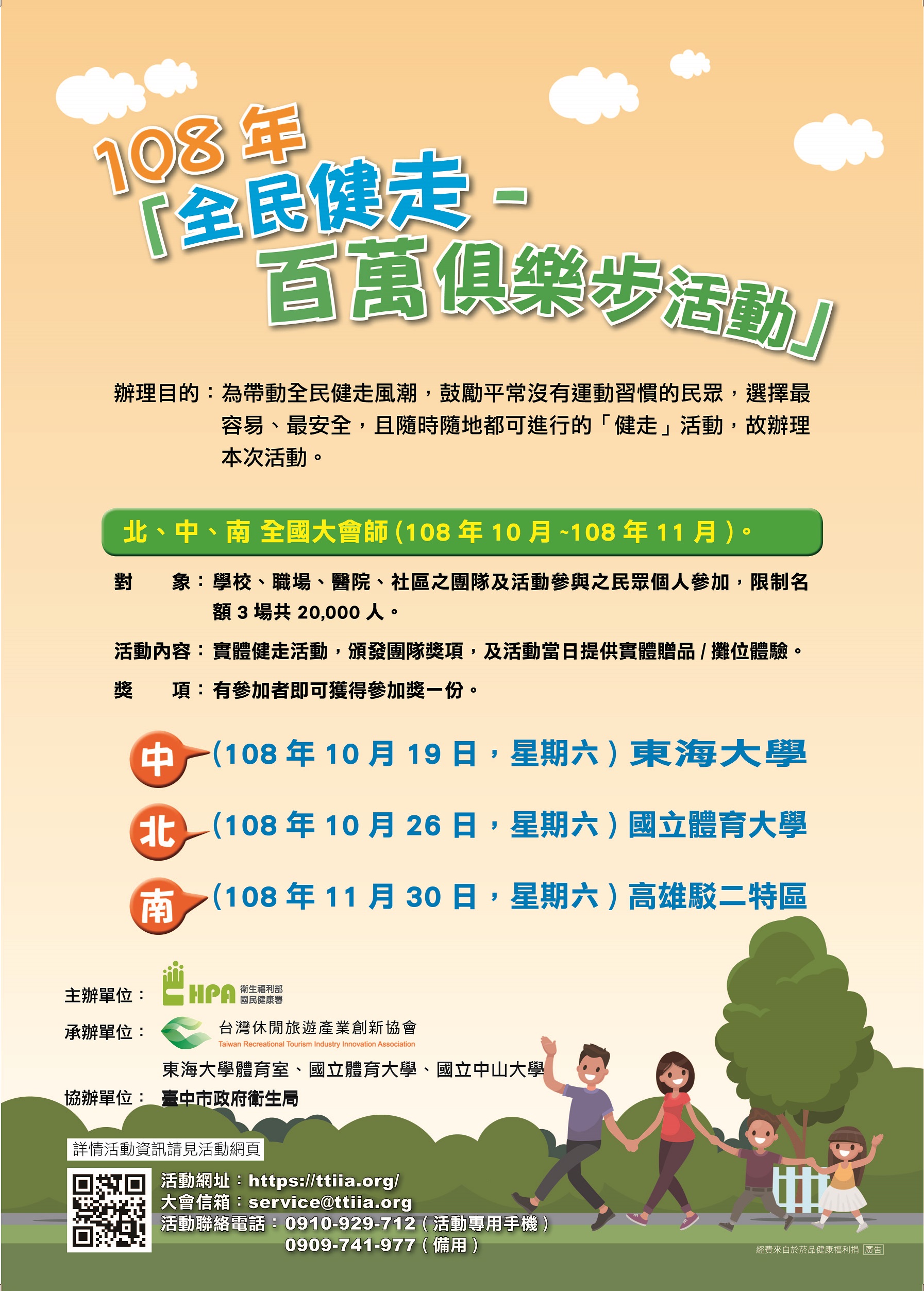 由國民健康署與台中市政府衛生局舉辦的「108年全民健走─百萬俱樂步活動」即將在明(19)日於東海大學田徑場開走!衛生局今日特別「真人開箱」健走「家私(工具的台語)」,提醒民眾記得帶水、帽子,穿著淺色透氣排汗運動衣與褲子、運動鞋,並做好防曬措施。
