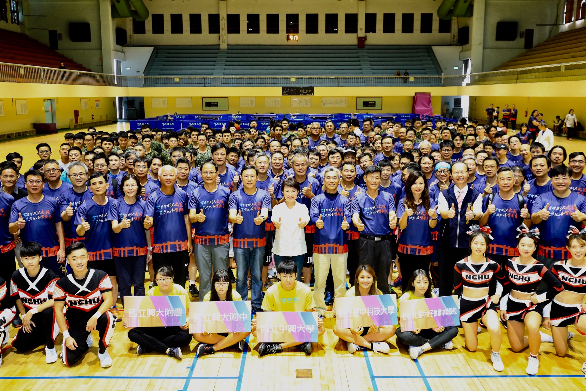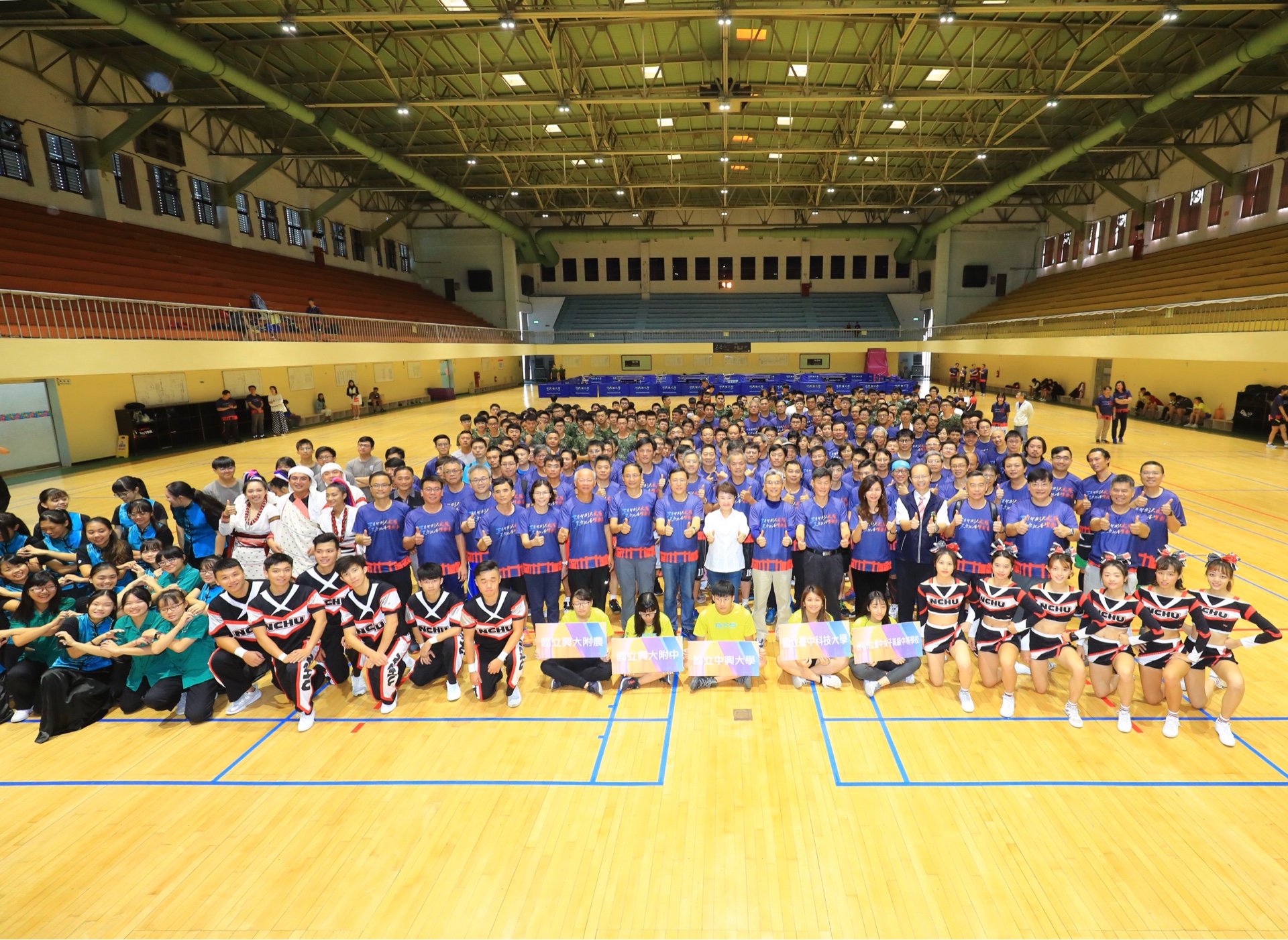 今日「三百年樹人成蔭,三世紀杏壇飄香」聯合球類運動,開幕典禮由中興大學競技啦啦隊熱舞揭開序幕,搭配台中科技大學口琴社及台中女中學絲竹樂合奏,還有三校原住民學生齊舞炒熱氣氛,教職員將透過籃球、羽球、桌球三項競賽慶祝百歲生日。