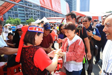 今日盧市長特地穿著賽德克族傳統服飾出席,並以泰雅族語「lokah」、阿美族語「Nga’ay ho」、布農族語「mihumisang uninang」、排灣族語「mali mali」向在場民眾問候,走訪體驗、美食、農特產、手工藝品展售等攤位,與原住民朋友近距離接觸,現場氣氛歡樂。