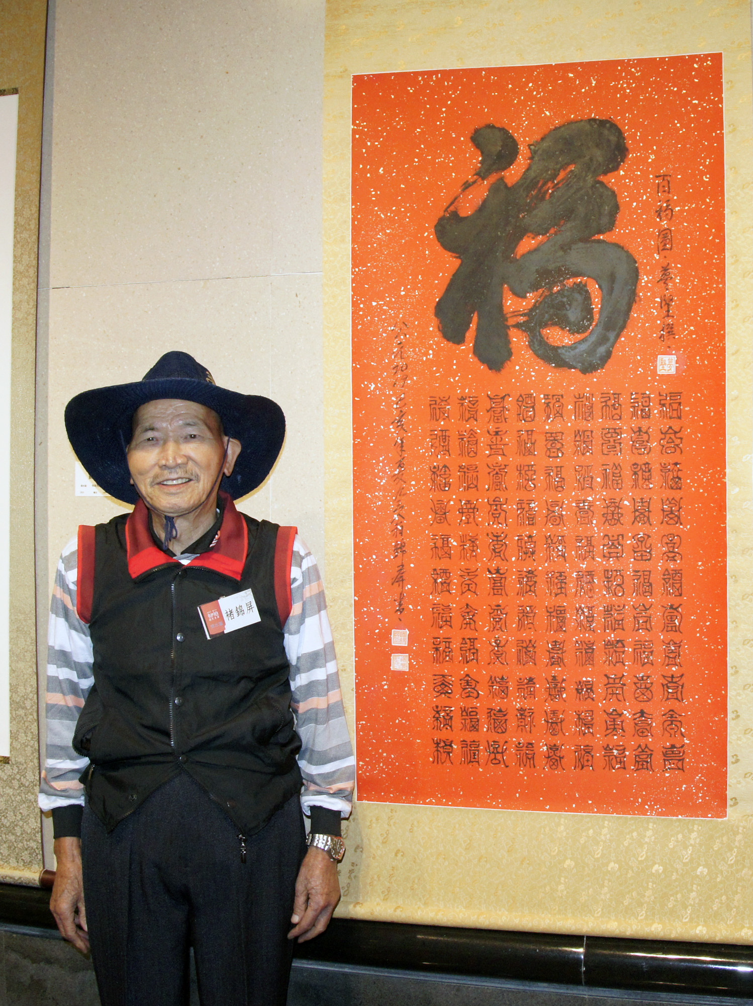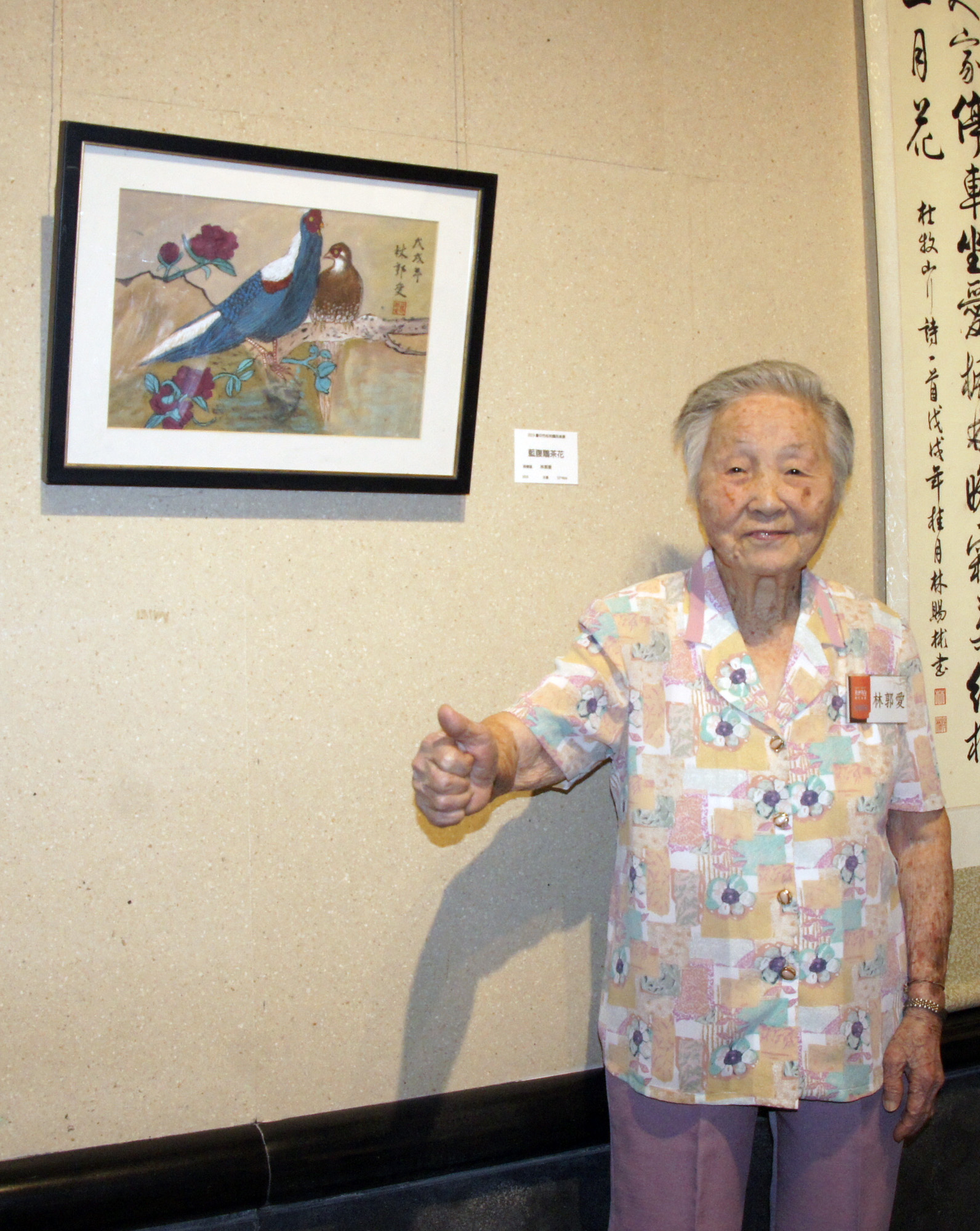 歐蔡對女士使用艷麗的油彩顏料,繪製了《海洋世界》,讓魚兒活靈活現地在水中悠游自得;林郭愛女士運用水墨技法繪製《藍腹鷴茶花》,讓人看見彩墨淡雅之美;《深山碧水似冠玉》為鍾波球先生紀念其93歲壽辰所繪製的作品,畫作上可見各種花鳥、蝶類,如黑鳳蝶、紅肩粉蝶、彩葉芋等,宛如一自然小百科;而褚錦屏先生的書法作品,以一「福」字為核心,將其進行變化創作出多元的字形樣態,獨樹一幟的《百福圖》令人驚豔。