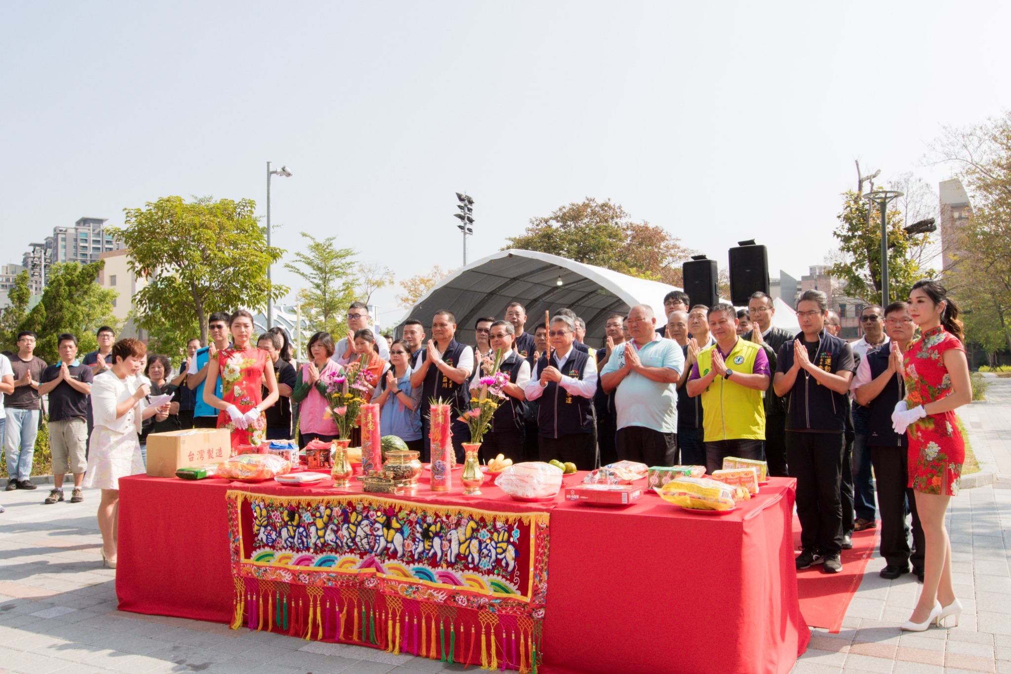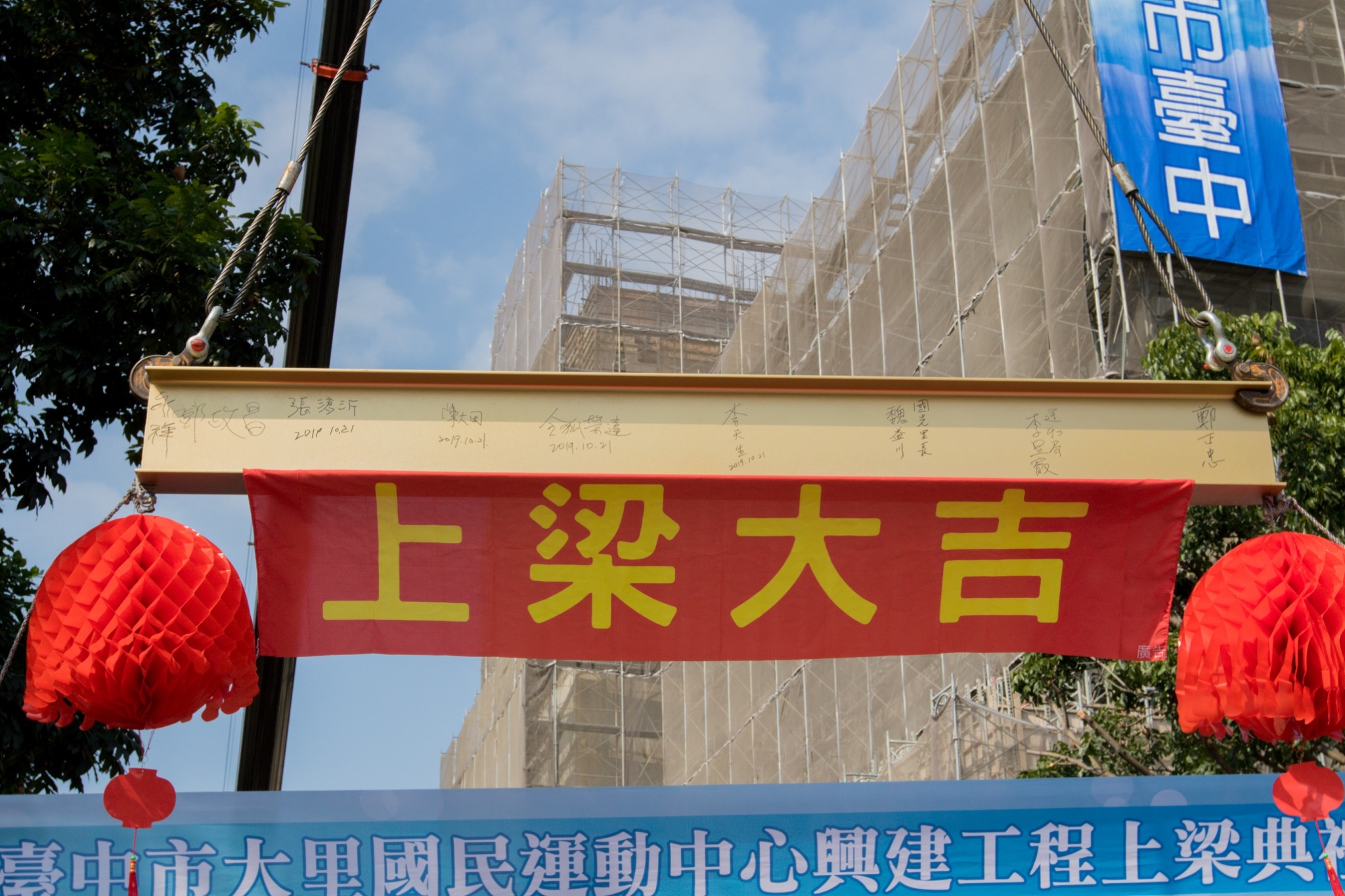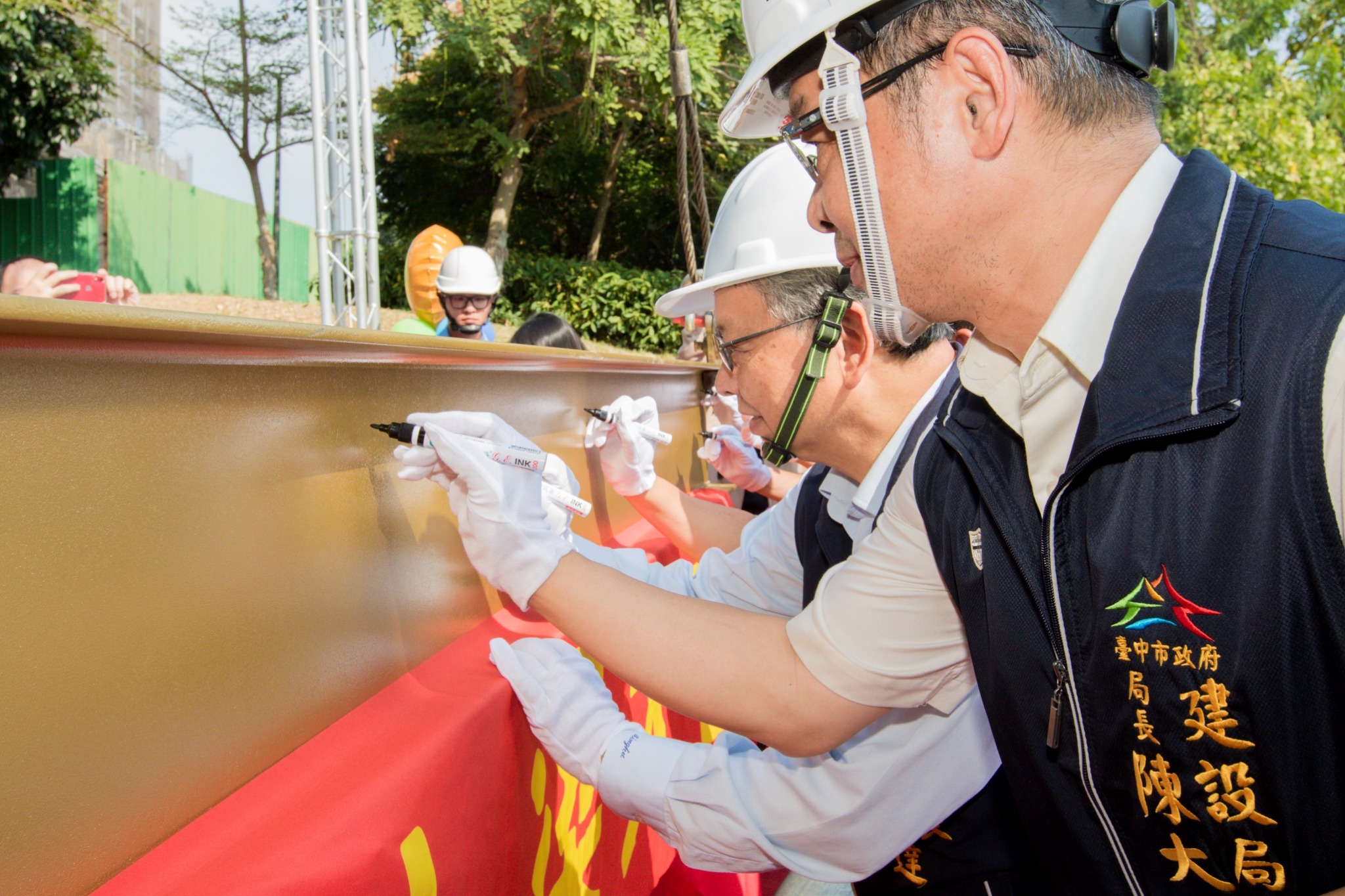 今日上梁典禮,令狐副市長在建設局陳局長、運動局李局長、新建工程處長葉双福、大里區長鄭正忠等人陪同下,與市議員李天生、張滄沂,以及立委何欣純、顏寬恒、市議員林德宇、林碧秀、蘇柏興、段緯宇服務處代表、當地多位里長一同祈福,祈求工程如期如質完工。(10/21*7)*建設局